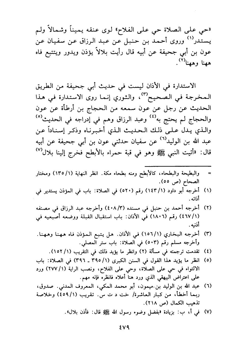 " حَيّ على الصَّلَاة حَيّ على الْفَلاح " لوى عُنُقه يَمِينا وَشمَالًا وَلم يستدر وروى أَحْمد بن حَنْبَل عَن عبد الرَّزَّاق عَن سُفْيَان عَن عون بن أبي جُحَيْفَة عَن أَبِيه قَالَ رَأَيْت بِلَالًا يُؤذن ويدور ويتتبع فَاه هَهُنَا وَهَهُنَا.