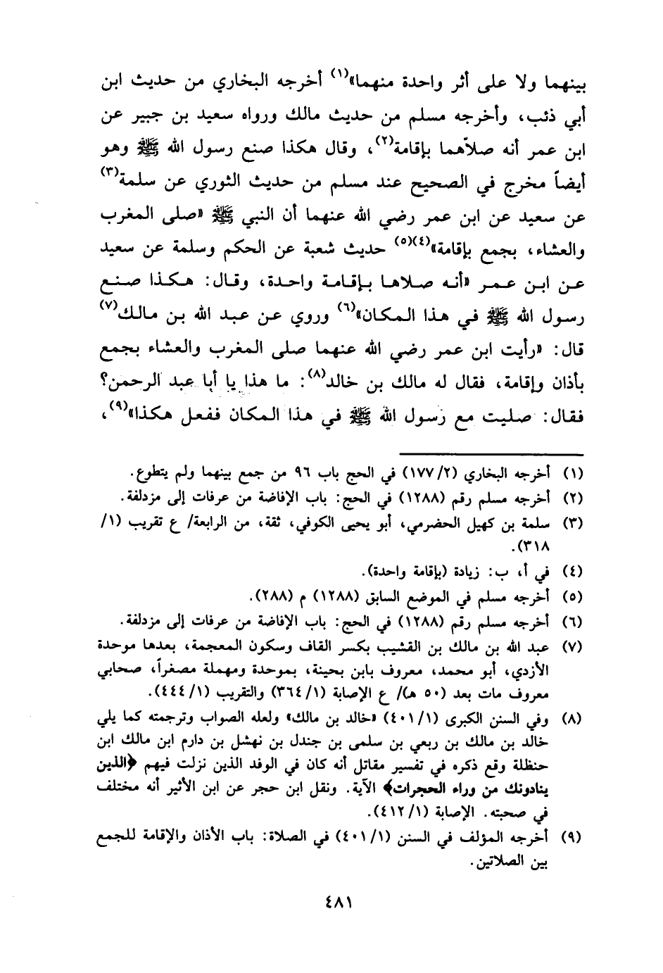 بَينهمَا وَلَا على أثر وَاحِدَة مِنْهُمَا " أخرجه البُخَارِيّ من حَدِيث ابْن أبي ذِئْب، وَأخرجه مُسلم من حَدِيث مَالك وَرَوَاهُ سعيد بن جُبَير عَن ابْن عمر أَنه صلاهما بِإِقَامَة، وَقَالَ هَكَذَا صنع رَسُول الله - صَلَّى اللَّهُ عَلَيْهِ وَسَلَّم َ - وَهُوَ أَيْضا مخرج فِي الصَّحِيح عِنْد مُسلم من حَدِيث الثَّوْريّ عَن سَلمَة عَن سعيد عَن ابْن عمر رَضِي الله عَنْهُمَا أَن النَّبِي - صَلَّى اللَّهُ عَلَيْهِ وَسَلَّم َ - " صلى الْمغرب وَالْعشَاء، بِجمع بِإِقَامَة " حَدِيث شُعْبَة عَن الحكم وَسَلَمَة عَن سعيد عَن ابْن عمر " أَنه صلاهَا بِإِقَامَة وَاحِدَة، وَقَالَ: هَكَذَا صنع رَسُول الله - صَلَّى اللَّهُ عَلَيْهِ وَسَلَّم َ - فِي هَذَا الْمَكَان " وَرُوِيَ عَن عبد الله بن مَالك قَالَ: " رَأَيْت ابْن عمر رَضِي الله عَنْهُمَا صلى الْمغرب وَالْعشَاء بِجمع بِأَذَان وَإِقَامَة، فَقَالَ لَهُ مَالك بن خَالِد: مَا هَذَا يَا أَبَا عبد الرَّحْمَن؟ فَقَالَ: صليت مَعَ رَسُول الله - صَلَّى اللَّهُ عَلَيْهِ وَسَلَّم َ - فِي هَذَا الْمَكَان فَفعل هَكَذَا "،