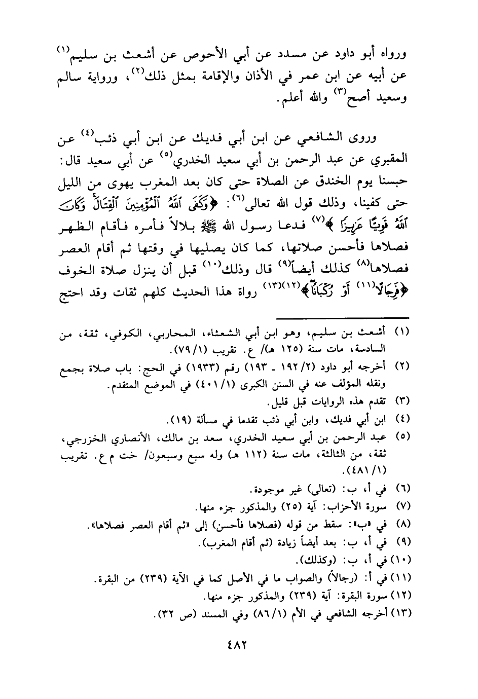 وروى الشَّافِعِي عَن ابْن أبي فديك عَن ابْن أبي ذِئْب عَن المَقْبُري عَن عبد الرَّحْمَن بن أبي سعيد الْخُدْرِيّ عَن أبي سعيد قَالَ: حبسنا يَوْم الخَنْدَق عَن الصَّلَاة حَتَّى كَانَ بعد الْمغرب يهوى من اللَّيْل حَتَّى كفينا، وَذَلِكَ قَول الله تَعَالَى: {وَكفى الله الْمُؤمنِينَ الْقِتَال وَكَانَ الله قَوِيا عَزِيزًا} فَدَعَا رَسُول الله - صَلَّى اللَّهُ عَلَيْهِ وَسَلَّم َ - بِلَال فَأمره فَأَقَامَ الظّهْر فَصلاهَا فَأحْسن صلَاتهَا، كَمَا كَانَ يُصليهَا فِي وَقتهَا ثمَّ أَقَامَ الْعَصْر فَصلاهَا كَذَلِك أَيْضا قَالَ وَذَلِكَ قبل أَن ينزل صَلَاة الْخَوْف {فرجالا أَو ركبانا} رُوَاة هَذَا الحَدِيث كلهم ثِقَات وَقد احْتج
