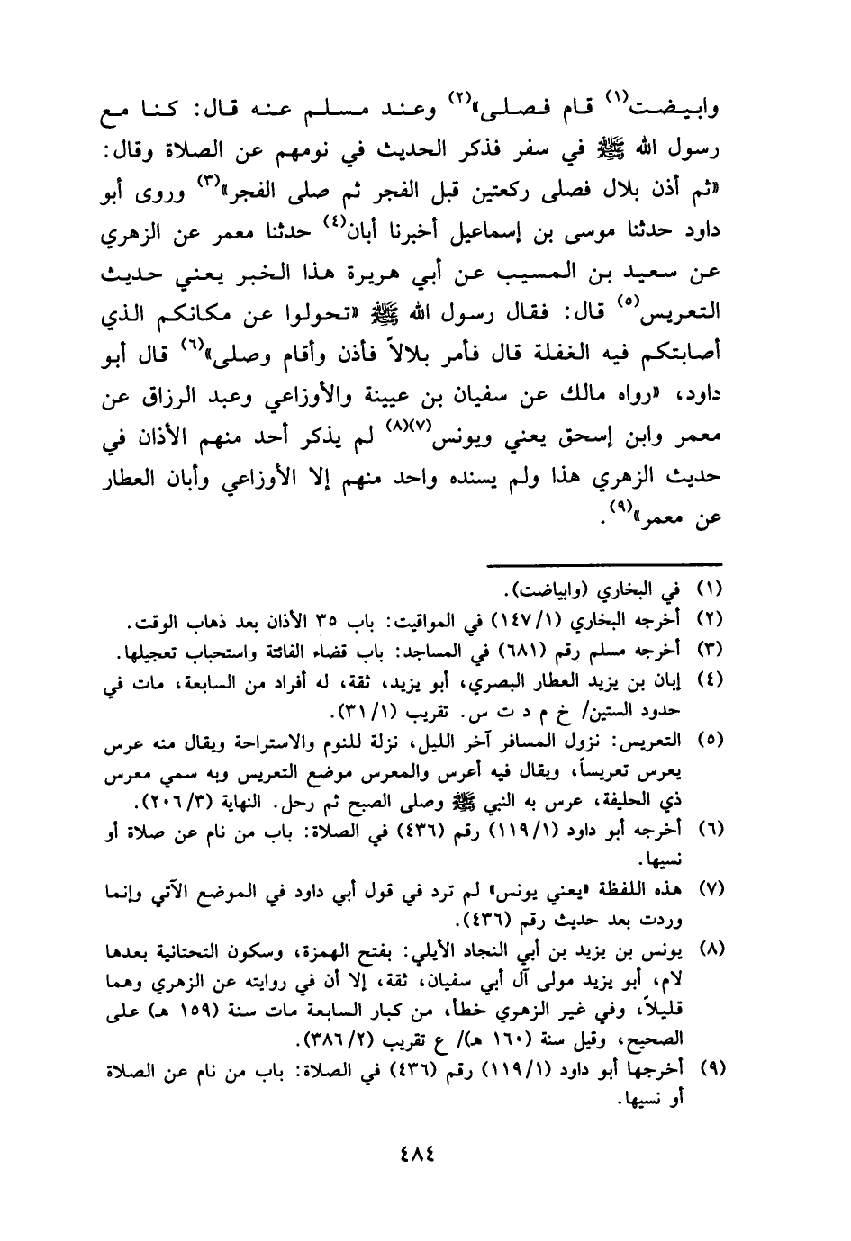 وابيضت قَامَ فصلى " وَعند مُسلم عَنهُ قَالَ: كُنَّا مَعَ رَسُول الله - صَلَّى اللَّهُ عَلَيْهِ وَسَلَّم َ - فِي سفر فَذكر الحَدِيث فِي نومهم عَن الصَّلَاة وَقَالَ: " ثمَّ أذن بِلَال فصلى رَكْعَتَيْنِ قبل الْفجْر ثمَّ صلى الْفجْر " وروى أَبُو دَاوُد حَدثنَا مُوسَى بن إِسْمَاعِيل أخبرنَا أبان حَدثنَا معمر عَن الزُّهْرِيّ عَن سعيد بن الْمسيب عَن أبي هُرَيْرَة هَذَا الْخَبَر يَعْنِي حَدِيث التَّعْرِيس قَالَ: فَقَالَ رَسُول الله - صَلَّى اللَّهُ عَلَيْهِ وَسَلَّم َ - " تحولوا عَن مَكَانكُمْ الَّذِي أَصَابَتْكُم فِيهِ الْغَفْلَة قَالَ فَأمر بِلَالًا فَأذن وَأقَام وَصلى " قَالَ أَبُو دَاوُد، " رَوَاهُ مَالك عَن سُفْيَان بن عُيَيْنَة وَالْأَوْزَاعِيّ وَعبد الرَّزَّاق عَن معمر وَابْن إِسْحَق يَعْنِي وَيُونُس لم يذكر أحد مِنْهُم الْأَذَان فِي حَدِيث الزُّهْرِيّ هَذَا وَلم يسْندهُ وَاحِد مِنْهُم إِلَّا الْأَوْزَاعِيّ وَأَبَان الْعَطَّار عَن معمر ".