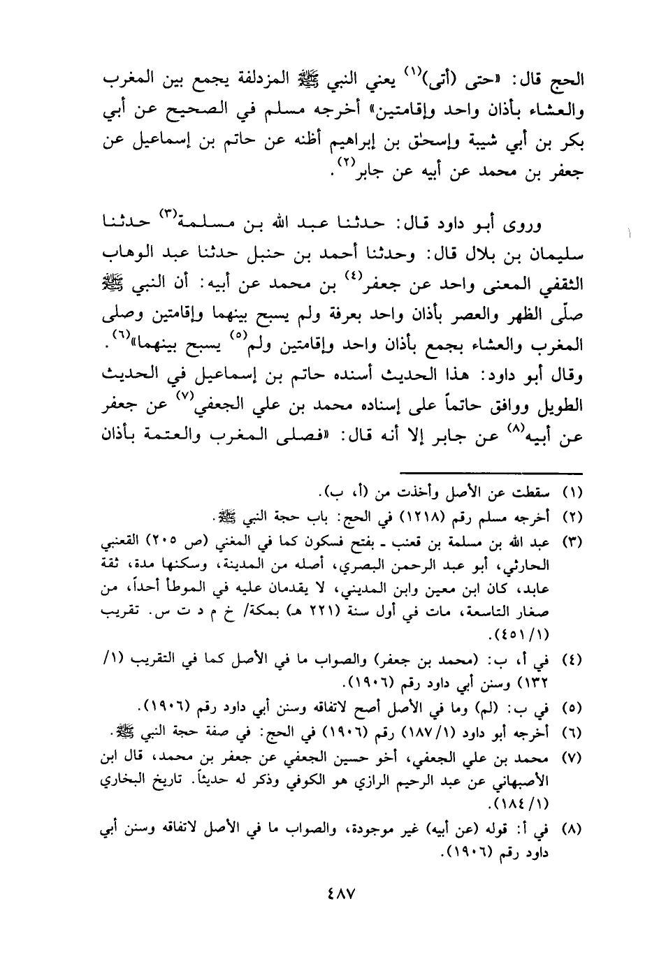 وَقَالَ أَبُو دَاوُد: هَذَا الحَدِيث أسْندهُ حَاتِم بن إِسْمَاعِيل فِي الحَدِيث الطَّوِيل وَوَافَقَ حاتما على إِسْنَاده مُحَمَّد بن عَليّ الْجعْفِيّ عَن جَعْفَر عَن أَبِيه عَن جَابر إِلَّا أَنه قَالَ: " فصلى الْمغرب وَالْعَتَمَة بِأَذَان