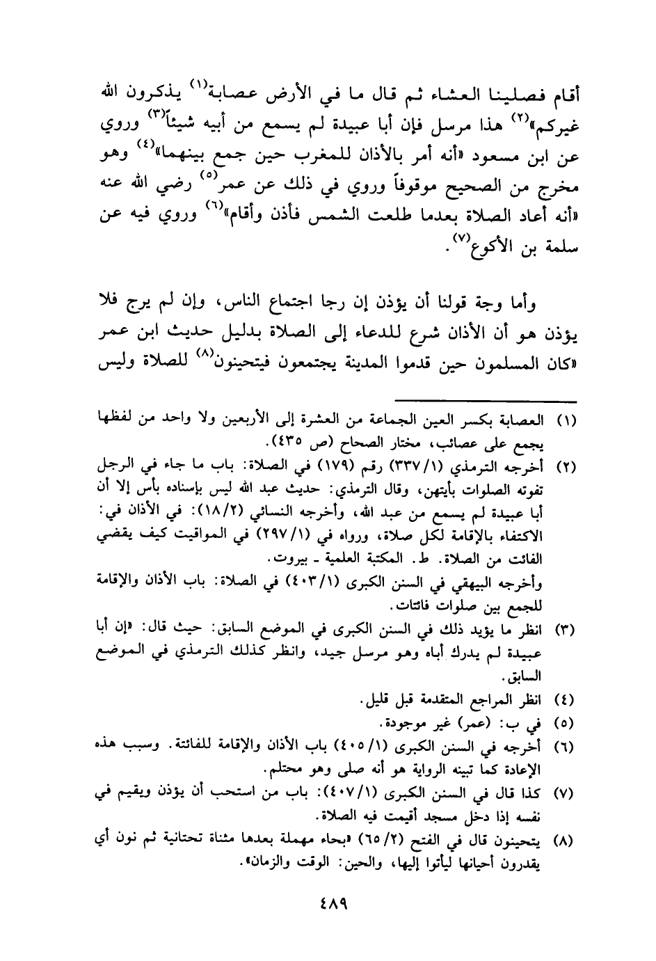 أَقَامَ فصلينا الْعشَاء ثمَّ قَالَ مَا فِي الأَرْض عِصَابَة يذكرُونَ الله غَيْركُمْ " هَذَا مُرْسل فَإِن أَبَا عُبَيْدَة لم يسمع من أَبِيه شَيْئا وَرُوِيَ عَن ابْن مَسْعُود " أَنه أَمر بِالْأَذَانِ للمغرب حِين جمع بَينهمَا " وَهُوَ مخرج من الصَّحِيح مَوْقُوفا وَرُوِيَ فِي ذَلِك عَن عمر رَضِي الله عَنهُ " أَنه أعَاد الصَّلَاة بَعْدَمَا طلعت الشَّمْس فَأذن وَأقَام " وَرُوِيَ فِيهِ عَن سَلمَة بن الْأَكْوَع.