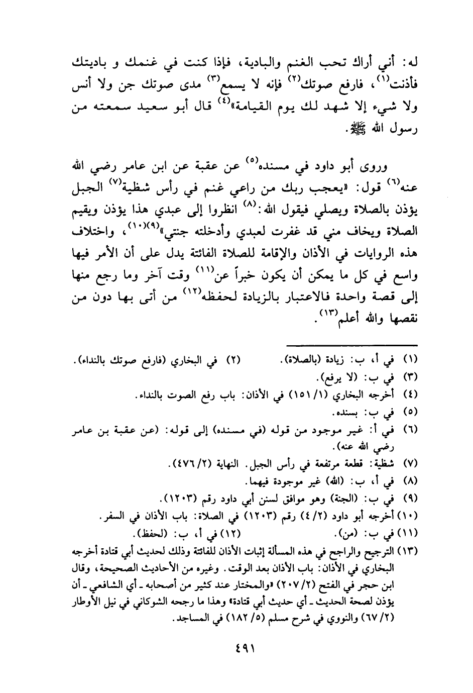 وروى أَبُو دَاوُد فِي مُسْنده عَن عقبَة عَن ابْن عَامر رَضِي الله عَنهُ قَول: " يعجب رَبك من راعي غنم فِي رَأس شظية الْجَبَل يُؤذن بِالصَّلَاةِ وَيُصلي فَيَقُول الله: انْظُرُوا إِلَى عَبدِي هَذَا يُؤذن وَيُقِيم الصَّلَاة وَيخَاف مني قد غفرت لعبدي وأدخلته جنتي "، وَاخْتِلَاف هَذِه الرِّوَايَات فِي الْأَذَان وَالْإِقَامَة للصَّلَاة الْفَائِتَة يدل على أَن الْأَمر فِيهَا وَاسع فِي كل مَا يُمكن أَن يكون خَبرا عَن وَقت آخر وَمَا رَجَعَ مِنْهَا إِلَى قصَّة وَاحِدَة فالاعتبار بِالزِّيَادَةِ لحفظه من أَتَى بهَا دون من نَقصهَا وَالله أعلم.
