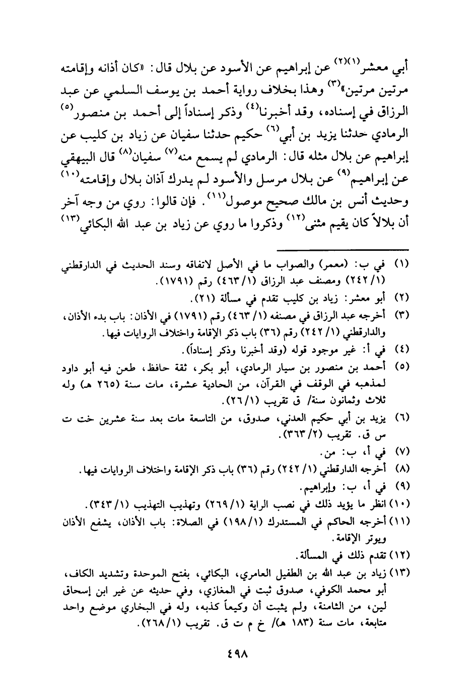 أبي معشر عَن إِبْرَاهِيم عَن الْأسود عَن بِلَال قَالَ: " كَانَ أَذَانه وإقامته مرَّتَيْنِ مرَّتَيْنِ " وَهَذَا بِخِلَاف رِوَايَة أَحْمد بن يُوسُف السّلمِيّ عَن عبد الرَّزَّاق فِي إِسْنَاده، وَقد أخبرنَا وَذكر إِسْنَادًا إِلَى أَحْمد بن مَنْصُور الرَّمَادِي حَدثنَا يزِيد بن أبي حَكِيم حَدثنَا سُفْيَان عَن زِيَاد بن كُلَيْب عَن إِبْرَاهِيم عَن بِلَال مثله قَالَ: الرَّمَادِي لم يسمع مِنْهُ سُفْيَان قَالَ الْبَيْهَقِيّ عَن إِبْرَاهِيم عَن بِلَال مُرْسل وَالْأسود لم يدْرك آذان بِلَال وإقامته وَحَدِيث أنس بن مَالك صَحِيح مَوْصُول. فَإِن قَالُوا: رُوِيَ من وَجه آخر أَن بِلَالًا كَانَ يُقيم مثنى وَذكروا مَا رُوِيَ عَن زِيَاد بن عبد الله البكائي