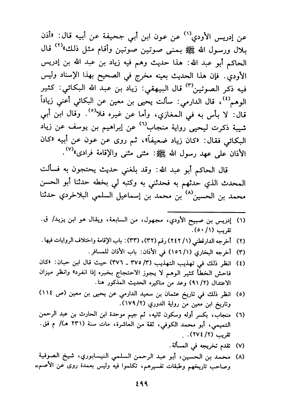 عَن إِدْرِيس الأودي عَن عون ابْن أبي جُحَيْفَة عَن أَبِيه قَالَ: " أذن بِلَال وَرَسُول الله - صَلَّى اللَّهُ عَلَيْهِ وَسَلَّم َ - بمنى صَوْتَيْنِ صَوْتَيْنِ وَأقَام مثل ذَلِك " قَالَ الْحَاكِم أَبُو عبد الله: هَذَا حَدِيث وهم فِيهِ زِيَاد بن عبد الله بن إِدْرِيس الأودي. فَإِن هَذَا الحَدِيث بِعَيْنِه مخرج فِي الصَّحِيح بِهَذَا الْإِسْنَاد وَلَيْسَ فِيهِ ذكر الصوتين قَالَ الْبَيْهَقِيّ: زِيَاد بن عبد الله البكائي: كثير الْوَهم، قَالَ الدَّارمِيّ: سَأَلت يحيى بن معِين عَن البكائي أَعنِي زيادا قَالَ: لَا بَأْس بِهِ فِي الْمَغَازِي، وَأما عَن غَيره فَلَا. وَقَالَ ابْن أبي شيبَة ذكرت ليحيى رِوَايَة منْجَاب عَن إِبْرَاهِيم بن يُوسُف عَن زِيَاد البكائي فَقَالَ: " كَانَ زِيَاد ضَعِيفا "، ثمَّ روى عَن عون عَن أَبِيه " كَانَ الْأَذَان على عهد رَسُول الله - صَلَّى اللَّهُ عَلَيْهِ وَسَلَّم َ -: مثنى مثنى وَالْإِقَامَة فُرَادَى ".