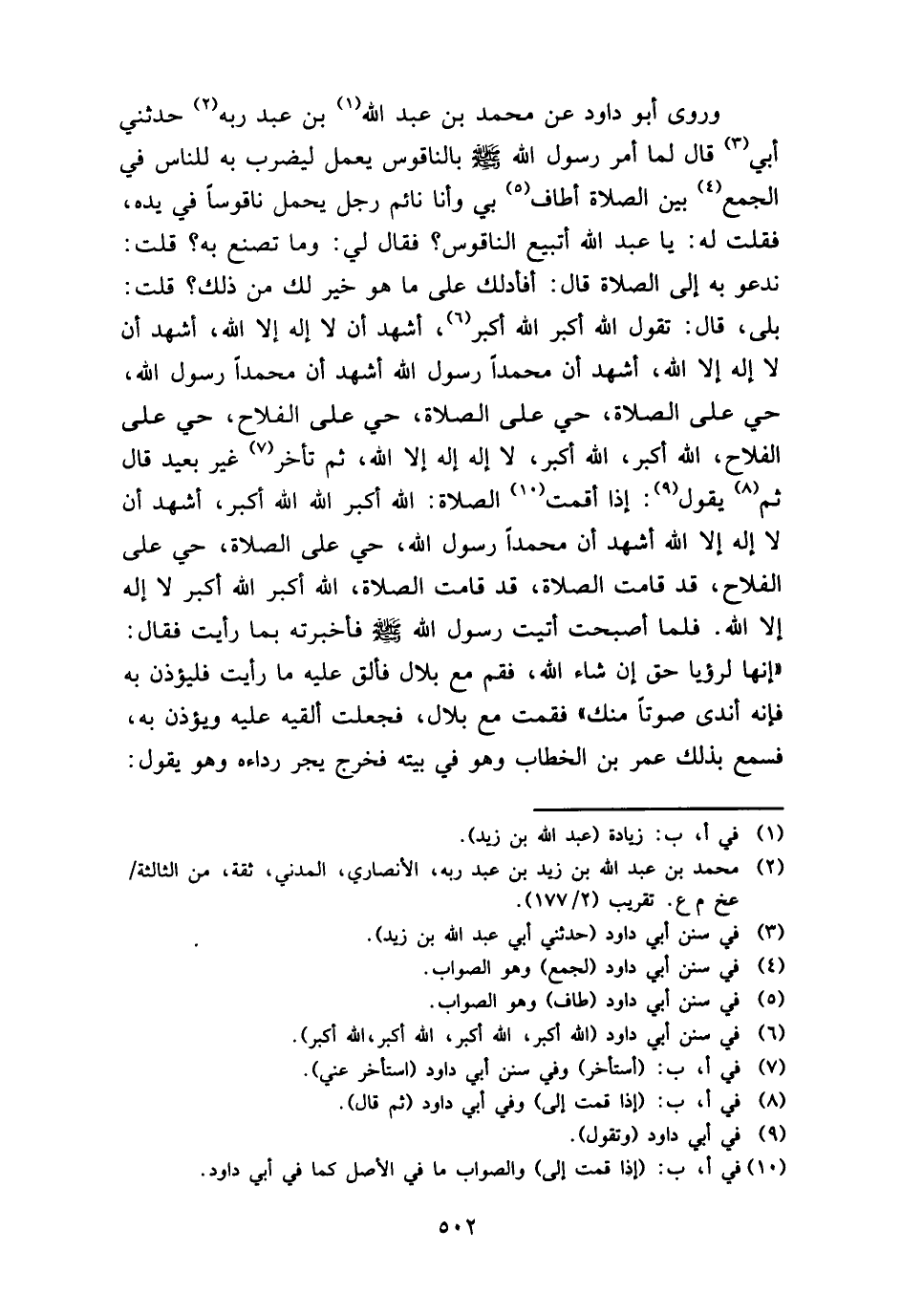 وروى أَبُو دَاوُد عَن مُحَمَّد بن عبد الله بن عبد ربه حَدثنِي أبي قَالَ لما أَمر رَسُول الله - صَلَّى اللَّهُ عَلَيْهِ وَسَلَّم َ - بالناقوس يعْمل ليضْرب بِهِ للنَّاس فِي الْجمع بَين الصَّلَاة أطاف بِي وَأَنا نَائِم رجل يحمل ناقوسا فِي يَده، فَقلت لَهُ: يَا عبد الله أتبيع الناقوس؟ فَقَالَ لي: وَمَا تصنع بِهِ؟ قلت: نَدْعُو بِهِ إِلَى الصَّلَاة قَالَ: أفأدلك على مَا هُوَ خير لَك من ذَلِك؟ قلت: بلَى، قَالَ: تَقول الله أكبر الله أكبر، أشهد أَن لَا إِلَه إِلَّا الله، أشهد أَن لَا إِلَه إِلَّا الله، أشهد أَن مُحَمَّدًا رَسُول الله أشهد أَن مُحَمَّدًا رَسُول الله، حَيّ على الصَّلَاة، حَيّ على الصَّلَاة، حَيّ على الْفَلاح، حَيّ على الْفَلاح، الله أكبر، الله أكبر، لَا إِلَه إِلَه إِلَّا الله، ثمَّ تَأَخّر غير بعيد قَالَ ثمَّ يَقُول: إِذا أَقمت الصَّلَاة: الله أكبر الله أكبر، أشهد أَن لَا إِلَه إِلَّا الله أشهد أَن مُحَمَّدًا رَسُول الله، حَيّ على الصَّلَاة، حَيّ على الْفَلاح، قد قَامَت الصَّلَاة، قد قَامَت الصَّلَاة، الله أكبر الله أكبر لَا إِلَه إِلَّا الله. فَلَمَّا أَصبَحت أتيت رَسُول الله - صَلَّى اللَّهُ عَلَيْهِ وَسَلَّم َ - فَأَخْبَرته بِمَا رَأَيْت فَقَالَ: " إِنَّهَا لرؤيا حق إِن شَاءَ الله، فَقُمْ مَعَ بِلَال فألق عَلَيْهِ مَا رَأَيْت فليؤذن بِهِ فَإِنَّهُ أندى صَوتا مِنْك " فَقُمْت مَعَ بِلَال، فَجعلت ألقيه عَلَيْهِ وَيُؤذن بِهِ، فَسمع بذلك عمر بن الْخطاب وَهُوَ فِي بَيته فَخرج يجر رِدَاءَهُ وَهُوَ يَقُول: