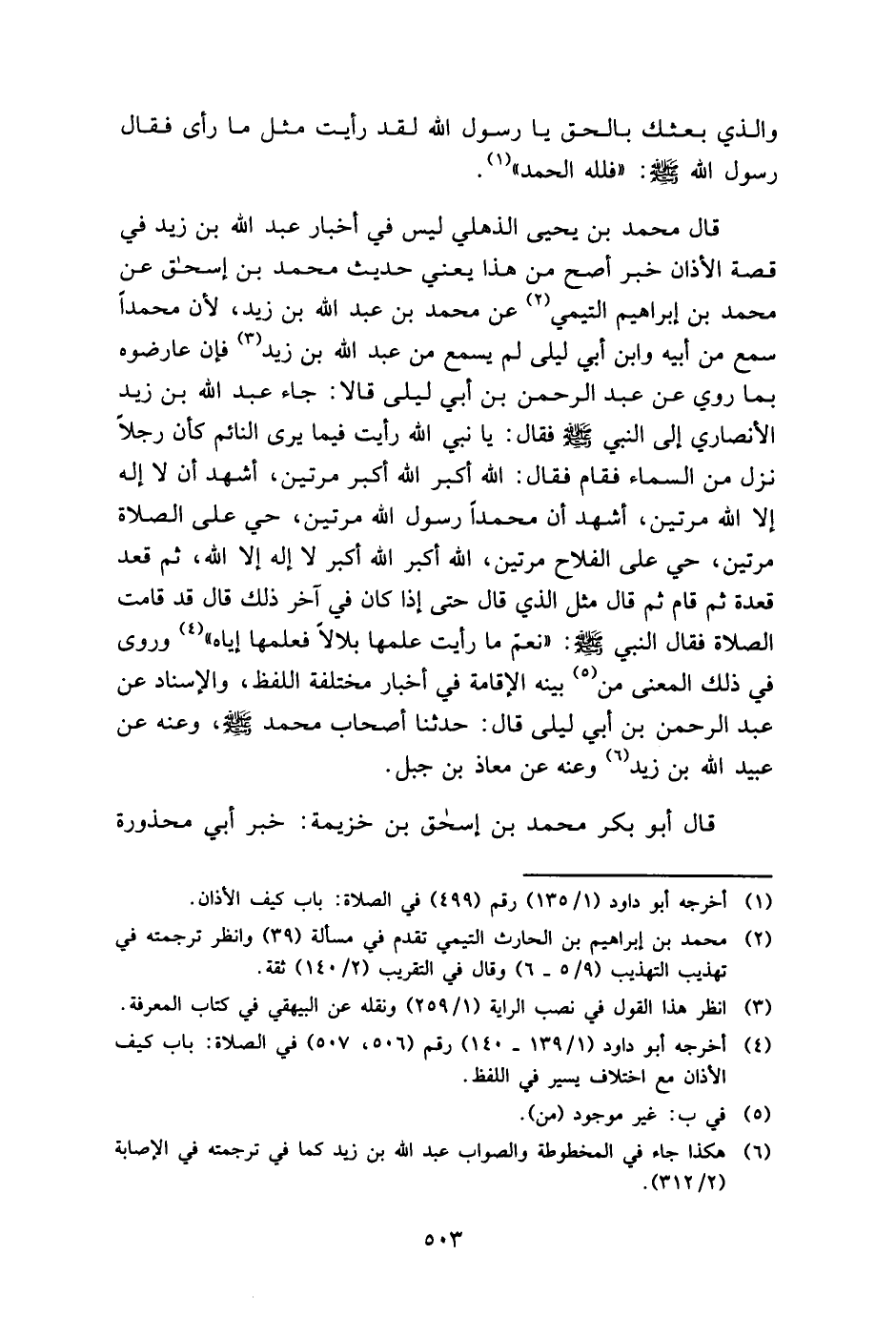 قَالَ مُحَمَّد بن يحيى الذهلي لَيْسَ فِي أَخْبَار عبد الله بن زيد فِي قصَّة الْأَذَان خبر أصح من هَذَا يَعْنِي حَدِيث مُحَمَّد بن إِسْحَق عَن مُحَمَّد بن إِبْرَاهِيم التَّيْمِيّ عَن مُحَمَّد بن عبد الله بن زيد، لِأَن مُحَمَّدًا سمع من أَبِيه وَابْن أبي ليلى لم يسمع من عبد الله بن زيد فَإِن عارضوه بِمَا رُوِيَ عَن عبد الرَّحْمَن بن أبي ليلى قَالَا: جَاءَ عبد الله بن زيد الْأنْصَارِيّ إِلَى النَّبِي - صَلَّى اللَّهُ عَلَيْهِ وَسَلَّم َ - فَقَالَ: يَا نَبِي الله رَأَيْت فِيمَا يرى النَّائِم كَأَن رجلا نزل من السَّمَاء فَقَامَ فَقَالَ: الله أكبر الله أكبر مرَّتَيْنِ، أشهد أَن لَا إِلَه إِلَّا الله مرَّتَيْنِ، أشهد أَن مُحَمَّدًا رَسُول الله مرَّتَيْنِ، حَيّ على الصَّلَاة مرَّتَيْنِ، حَيّ على الْفَلاح مرَّتَيْنِ، الله أكبر الله أكبر لَا إِلَه إِلَّا الله، ثمَّ قعد قعدة ثمَّ قَامَ ثمَّ قَالَ مثل الَّذِي قَالَ حَتَّى إِذا كَانَ فِي آخر ذَلِك قَالَ قد قَامَت الصَّلَاة فَقَالَ النَّبِي - صَلَّى اللَّهُ عَلَيْهِ وَسَلَّم َ -: " نعم مَا رَأَيْت علمهَا بِلَالًا فعلمها إِيَّاه " وروى فِي ذَلِك الْمَعْنى من بَينه الْإِقَامَة فِي أَخْبَار مُخْتَلفَة اللَّفْظ، والإسناد عَن عبد الرَّحْمَن بن أبي ليلى قَالَ: حَدثنَا أَصْحَاب مُحَمَّد - صَلَّى اللَّهُ عَلَيْهِ وَسَلَّم َ -، وَعنهُ عَن عبيد الله بن زيد وَعنهُ عَن معَاذ بن جبل.