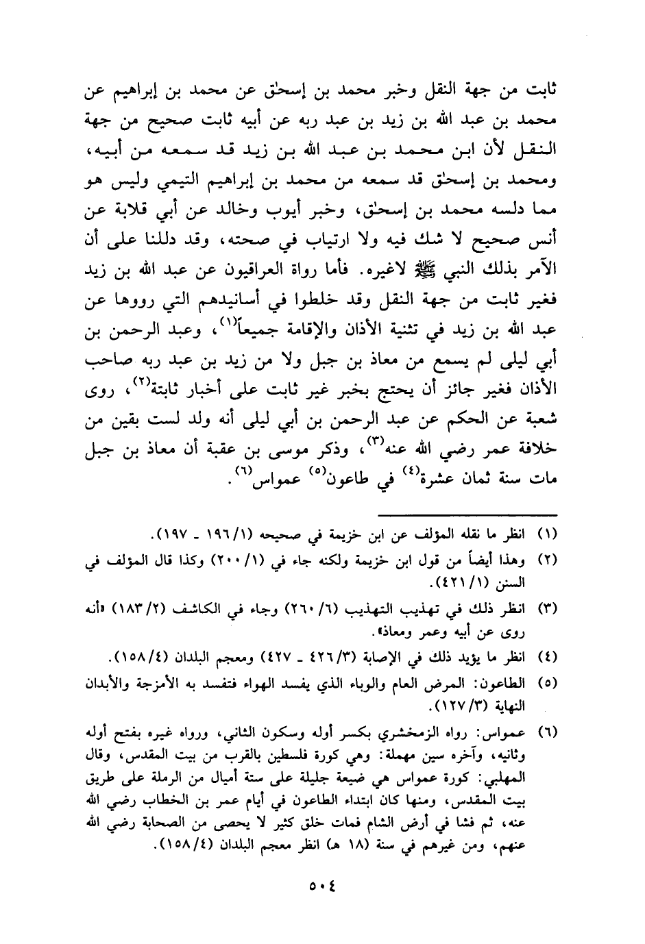 ثَابت من جِهَة النَّقْل وَخبر مُحَمَّد بن إِسْحَق عَن مُحَمَّد بن إِبْرَاهِيم عَن مُحَمَّد بن عبد الله بن زيد بن عبد ربه عَن أَبِيه ثَابت صَحِيح من جِهَة النَّقْل لِأَن ابْن مُحَمَّد بن عبد الله بن زيد قد سَمعه من أَبِيه، وَمُحَمّد بن إِسْحَق قد سَمعه من مُحَمَّد بن إِبْرَاهِيم التَّيْمِيّ وَلَيْسَ هُوَ مِمَّا دلسه مُحَمَّد بن إِسْحَق، وَخبر أَيُّوب وخَالِد عَن أبي قلَابَة عَن أنس صَحِيح لَا شكّ فِيهِ وَلَا ارتياب فِي صِحَّته، وَقد دللنا على أَن الْآمِر بذلك النَّبِي - صَلَّى اللَّهُ عَلَيْهِ وَسَلَّم َ - لَا غَيره. فَأَما رُوَاة الْعِرَاقِيُّونَ عَن عبد الله بن زيد فَغير ثَابت من جِهَة النَّقْل وَقد خلطوا فِي أسانيدهم الَّتِي رووها عَن عبد الله بن زيد فِي تَثْنِيَة الْأَذَان وَالْإِقَامَة جَمِيعًا، وَعبد الرَّحْمَن بن أبي ليلى لم يسمع من معَاذ بن جبل وَلَا من زيد بن عبد ربه صَاحب الْأَذَان فَغير جَائِز أَن يحْتَج بِخَبَر غير ثَابت على أَخْبَار ثَابِتَة، روى شُعْبَة عَن الحكم عَن عبد الرَّحْمَن بن أبي ليلى أَنه ولد لست بَقينَ من خلَافَة عمر رَضِي الله عَنهُ، وَذكر مُوسَى بن عقبَة أَن معَاذ بن جبل مَاتَ سنة ثَمَان عشرَة فِي طاعون عمواس.