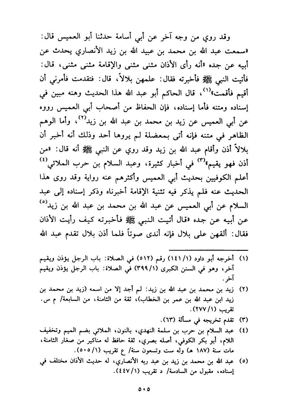 وَقد رُوِيَ من وَجه آخر عَن أبي أُسَامَة حَدثنَا أَبُو العميس قَالَ: " سَمِعت عبد الله بن مُحَمَّد بن عبيد الله بن زيد الْأنْصَارِيّ يحدث عَن أَبِيه عَن جده " أَنه رأى الْأَذَان مثنى مثنى وَالْإِقَامَة مثنى مثنى، قَالَ: فَأتيت النَّبِي - صَلَّى اللَّهُ عَلَيْهِ وَسَلَّم َ - فَأَخْبَرته فَقَالَ: علمهن بِلَالًا، قَالَ: فتقدمت فَأمرنِي أَن أقيم فأقمت "، قَالَ الْحَاكِم أَبُو عبد الله هَذَا الحَدِيث وهنه مُبين فِي إِسْنَاده وَمَتنه فَأَما إِسْنَاده، فَإِن الْحفاظ من أَصْحَاب أبي العميس رَوَوْهُ عَن أبي العميس عَن زيد بن مُحَمَّد بن عبد الله بن زيد، وَأما الْوَهم الظَّاهِر فِي مَتنه فَإِنَّهُ أَتَى بمعضلة لم يروها أحد وَذَلِكَ أَنه أخبر أَن بِلَالًا أذن وَأقَام عبد الله بن زيد وَقد رُوِيَ عَن النَّبِي - صَلَّى اللَّهُ عَلَيْهِ وَسَلَّم َ - أَنه قَالَ: " من أذن فَهُوَ يُقيم " فِي أَخْبَار كَثِيرَة، وَعبد السَّلَام بن حَرْب الْملَائي أعلم الْكُوفِيّين بِحَدِيث أبي العميس وَأَكْثَرهم عَنهُ رِوَايَة وَقد روى هَذَا الحَدِيث عَنهُ فَلم يذكر فِيهِ تَثْنِيَة الْإِقَامَة أخبرناه وَذكر إِسْنَاده إِلَى عبد السَّلَام عَن أبي العميس عَن عبد الله بن مُحَمَّد بن عبد الله بن زيد عَن أَبِيه عَن جده " قَالَ أتيت النَّبِي - صَلَّى اللَّهُ عَلَيْهِ وَسَلَّم َ - فَأَخْبَرته كَيفَ رَأَيْت الْأَذَان فَقَالَ: ألقهن على بِلَال فَإِنَّهُ أندى صَوتا فَلَمَّا أذن بِلَال تقدم عبد الله