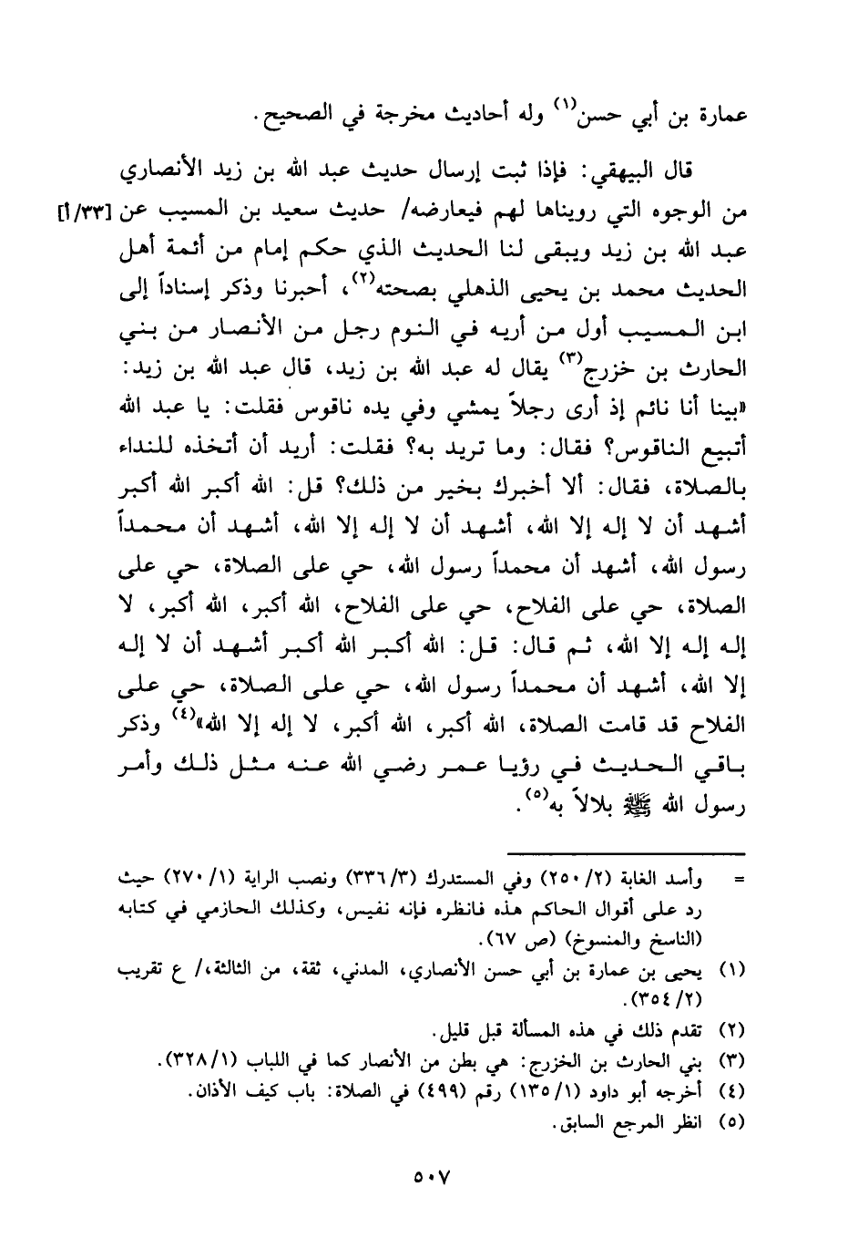 قَالَ الْبَيْهَقِيّ: فَإِذا ثَبت إرْسَال حَدِيث عبد الله بن زيد الْأنْصَارِيّ من الْوُجُوه الَّتِي رويناها لَهُم فيعارضه حَدِيث سعيد بن الْمسيب عَن عبد الله بن زيد وَيبقى لنا الحَدِيث الَّذِي حكم إِمَام من أَئِمَّة أهل الحَدِيث مُحَمَّد بن يحيى الذهلي بِصِحَّتِهِ، أخبرنَا وَذكر إِسْنَادًا إِلَى ابْن الْمسيب أول من أريه فِي النّوم رجل من الْأَنْصَار من بني الْحَارِث بن خزرج يُقَال لَهُ عبد الله بن زيد، قَالَ عبد الله بن زيد: " بَينا أَنا نَائِم إِذْ أرى رجلا يمشي وَفِي يَده ناقوس فَقلت: يَا عبد الله أتبيع الناقوس؟ فَقَالَ: وَمَا تُرِيدُ بِهِ؟ فَقلت: أُرِيد أَن أتخذه للنداء بِالصَّلَاةِ، فَقَالَ: أَلا أخْبرك بِخَير من ذَلِك؟ قَالَ: الله أكبر الله أكبر أشهد أَن لَا إِلَه إِلَّا الله، أشهد أَن لَا إِلَه إِلَّا الله، أشهد أَن مُحَمَّدًا رَسُول الله، أشهد أَن مُحَمَّدًا رَسُول الله، حَيّ على الصَّلَاة، حَيّ على الصَّلَاة، حَيّ على الْفَلاح، حَيّ على الْفَلاح، الله أكبر، الله أكبر، لَا إِلَه إِلَه إِلَّا الله، ثمَّ قَالَ: قل: الله أكبر الله أكبر أشهد أَن لَا إِلَه إِلَّا الله، أشهد أَن مُحَمَّدًا رَسُول الله، حَيّ على الصَّلَاة، حَيّ على الْفَلاح قد قَامَت الصَّلَاة، الله أكبر، الله أكبر، لَا إِلَه إِلَّا الله " وَذكر بَاقِي الحَدِيث فِي رُؤْيا عمر رَضِي الله عَنهُ مثل ذَلِك وَأمر رَسُول الله - صَلَّى اللَّهُ عَلَيْهِ وَسَلَّم َ - بِلَالًا بِهِ.