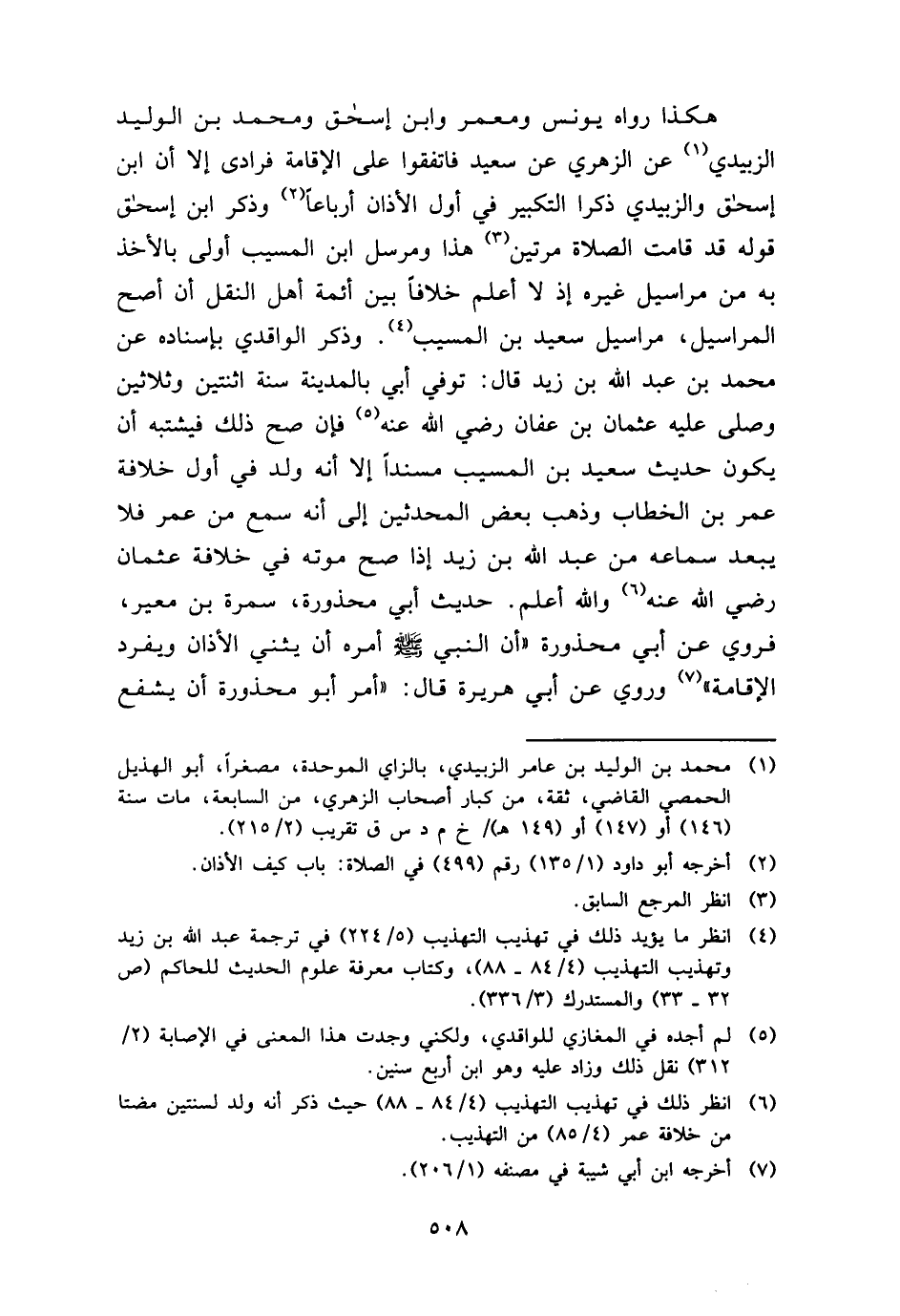 هَكَذَا رَوَاهُ يُونُس وَمعمر وَابْن إِسْحَق وَمُحَمّد بن الْوَلِيد الزبيدِيّ عَن الزُّهْرِيّ عَن سعيد فاتفقوا على الْإِقَامَة فُرَادَى إِلَّا أَن ابْن إِسْحَق والزبيدي ذكرا التَّكْبِير فِي أول الْأَذَان أَربَاعًا وَذكر ابْن إِسْحَق قَوْله قد قَامَت الصَّلَاة مرَّتَيْنِ هَذَا ومرسل ابْن الْمسيب أولى بِالْأَخْذِ بِهِ من مَرَاسِيل غَيره إِذْ لَا أعلم خلافًا بَين أَئِمَّة أهل النَّقْل أَن أصح الْمَرَاسِيل، مَرَاسِيل سعيد بن الْمسيب. وَذكر الْوَاقِدِيّ بِإِسْنَاد عَن مُحَمَّد بن عبد الله بن زيد قَالَ: توفّي أبي بِالْمَدِينَةِ سنة اثْنَتَيْنِ وَثَلَاثِينَ وَصلى عَلَيْهِ عُثْمَان بن عَفَّان رَضِي الله عَنهُ فَإِن صَحَّ ذَلِك فيشتبه أَن يكون حَدِيث سعيد بن الْمسيب مُسْندًا إِلَّا أَنه ولد فِي أول خلَافَة عمر بن الْخطاب وَذهب بعض الْمُحدثين إِلَى أَنه سمع من عمر فَلَا يبعد سَمَاعه من عبد الله بن زيد إِذا صَحَّ مَوته فِي خلَافَة عُثْمَان رَضِي الله عَنهُ وَالله أعلم. حَدِيث أبي مَحْذُورَة، سَمُرَة بن معير، فَروِيَ عَن أبي مَحْذُورَة " أَن النَّبِي - صَلَّى اللَّهُ عَلَيْهِ وَسَلَّم َ - أمره أَن يثني الْأَذَان ويفرد الْإِقَامَة " وَرُوِيَ عَن أبي هُرَيْرَة قَالَ: " أَمر أَبُو مَحْذُورَة أَن يشفع