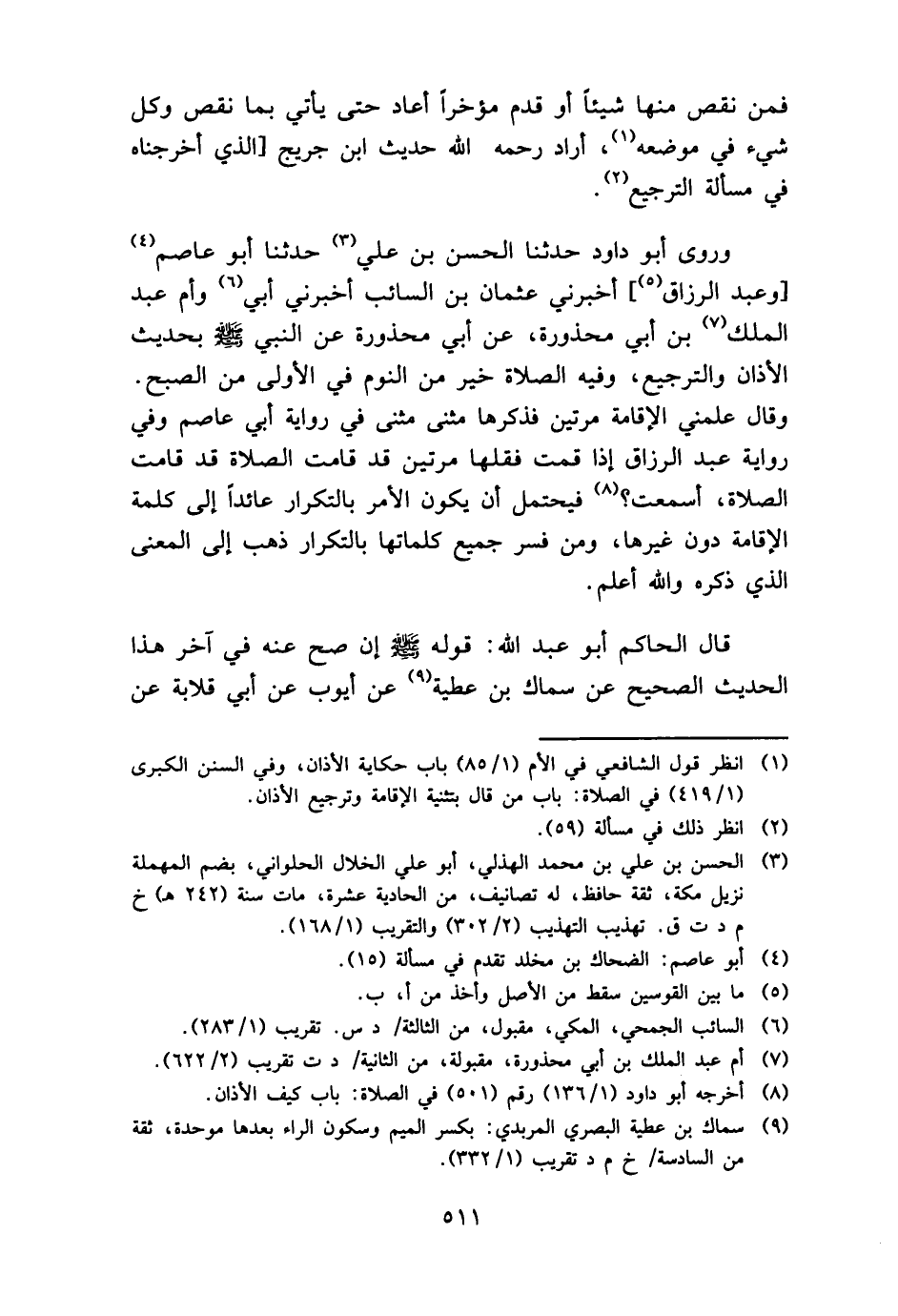 وروى أَبُو دَاوُد حَدثنَا الْحسن بن عَليّ حَدثنَا أَبُو عَاصِم [وَعبد الرَّزَّاق] أَخْبرنِي عُثْمَان بن السَّائِب أَخْبرنِي أبي وَأم عبد الْملك بن أبي مَحْذُورَة، عَن أبي مَحْذُورَة عَن النَّبِي - صَلَّى اللَّهُ عَلَيْهِ وَسَلَّم َ - بِحَدِيث الْأَذَان والترجيع، وَفِيه الصَّلَاة خير من النّوم فِي الأولى من الصُّبْح. وَقَالَ عَلمنِي الْإِقَامَة مرَّتَيْنِ فَذكرهَا مثنى مثنى فِي رِوَايَة أبي عَاصِم وَفِي رِوَايَة عبد الرَّزَّاق إِذا قُمْت فقلها مرَّتَيْنِ قد قَامَت الصَّلَاة قد قَامَت الصَّلَاة، أسمعت؟ فَيحْتَمل أَن يكون الْأَمر بالتكرار عَائِدًا إِلَى كلمة الْإِقَامَة دون غَيرهَا، وَمن فسر جَمِيع كلماتها بالتكرار ذهب إِلَى الْمَعْنى الَّذِي ذكره وَالله أعلم.