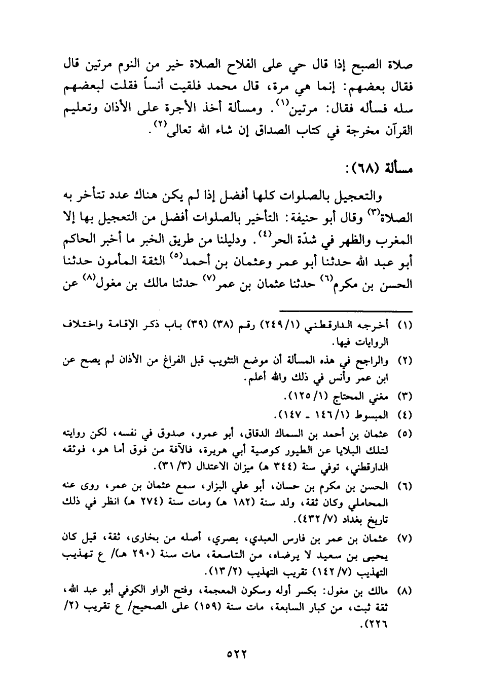 والتعجيل بالصلوات كلهَا أفضل إِذا لم يكن هُنَاكَ عدد تتأخر بِهِ الصَّلَاة وَقَالَ أَبُو حنيفَة: التَّأْخِير بالصلوات أفضل من التَّعْجِيل بهَا إِلَّا الْمغرب وَالظّهْر فِي شدَّة الْحر. وَدَلِيلنَا من طَرِيق الْخَبَر مَا أخبر الْحَاكِم أَبُو عبد الله حَدثنَا أَبُو عمر وَعُثْمَان بن أَحْمد الثِّقَة الْمَأْمُون حَدثنَا الْحسن بن مكرم حَدثنَا عُثْمَان بن عمر حَدثنَا مَالك بن مغول عَن