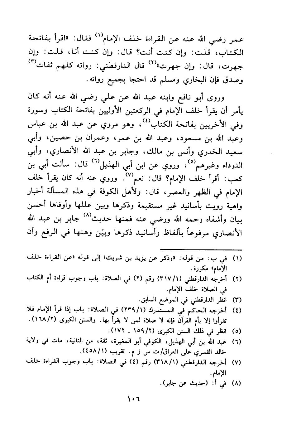 عمر رَضِي الله عَنهُ عَن الْقِرَاءَة خلف الإِمَام فَقَالَ: " اقْرَأ بِفَاتِحَة الْكتاب، قلت: وَإِن كنت أَنْت؟ قَالَ: وَإِن كنت أَنا، قلت: وَإِن جهرت، قَالَ: وَإِن جهرت " قَالَ الدَّارَقُطْنِيّ: رُوَاته كلهم ثِقَات وَصدق فَإِن البُخَارِيّ وَمُسلم قد احتجا بِجَمِيعِ رُوَاته.