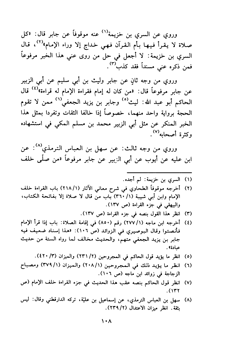 وَرُوِيَ عَن السّري بن خُزَيْمَة عَنهُ مَوْقُوفا عَن جَابر قَالَ: " كل صَلَاة لَا يقْرَأ فِيهَا بِأم الْقُرْآن فَهِيَ خداج إِلَّا وَرَاء الإِمَام "، قَالَ السّري بن خُزَيْمَة: لَا أجعَل فِي حل من روى عني هَذَا الْخَبَر مَرْفُوعا فَمن ذكره عني مُسْندًا فقد كذب.