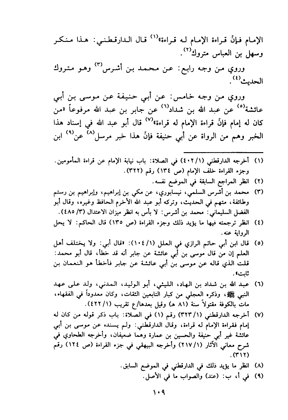 وَرُوِيَ من وَجه خَامِس: عَن أبي حنيفَة عَن مُوسَى بن أبي عَائِشَة عَن عبد الله بن شَدَّاد عَن جَابر بن عبد الله مَرْفُوعا " من كَانَ لَهُ إِمَام فَإِن قِرَاءَة الإِمَام لَهُ قِرَاءَة " قَالَ أَبُو عبد الله فِي إِسْنَاد هَذَا الْخَبَر وهم من الروَاة عَن أبي حنيفَة فَإِن هَذَا خبر مُرْسل عَن ابْن
