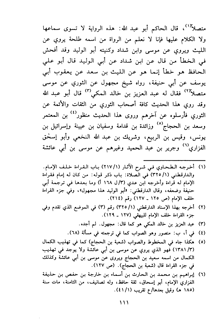 مُتَّصِلا، قَالَ الْحَاكِم أَبُو عبد الله: هَذِه الرِّوَايَة لَا تسوى سماعهَا وَلَا الْكَلَام عَلَيْهَا فَإنَّا لَا نعلم من الروَاة من اسْمه طَلْحَة يروي عَن اللَّيْث ويروي عَن مُوسَى وَابْن شَدَّاد وكنيته أَبُو الْوَلِيد وَقد أفحش فِي الْخَطَأ من قَالَ عَن ابْن شَدَّاد عَن أبي الْوَلِيد قَالَ أَبُو عَليّ الْحَافِظ هُوَ خطأ إِنَّمَا هُوَ عَن اللَّيْث بن سعد عَن يَعْقُوب أبي يُوسُف عَن أبي حنيفَة، رَوَاهُ شيخ مَجْهُول عَن الثَّوْريّ عَن مُوسَى مُتَّصِلا فَقَالَ لَهُ عبد الْعَزِيز بن خَالِد الْمَكِّيّ قَالَ أَبُو عبد الله وَقد رُوِيَ هَذَا الحَدِيث كَافَّة أَصْحَاب الثَّوْريّ من الثِّقَات وَالْأَئِمَّة عَن الثَّوْريّ فَأَرْسلُوهُ عَن آخِرهم وروى هَذَا الحَدِيث مَنْظُور بن الْمُعْتَمِر وَسعد بن الْحجَّاج وزائدة بن قدامَة وسُفْيَان بن عُيَيْنَة وَإِسْرَائِيل بن يُونُس، وَقيس بن الرّبيع، وَشريك بن عبد الله النَّخعِيّ وَأَبُو إِسْحَق الْفَزارِيّ وَجَرِير بن عبد الحميد وَغَيرهم عَن مُوسَى بن أبي عَائِشَة