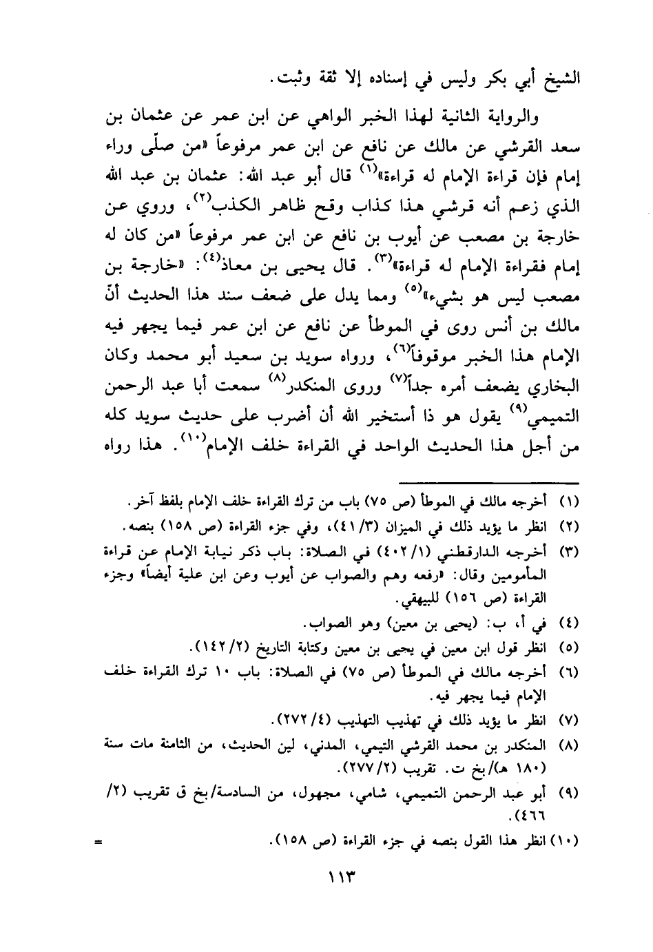 وَالرِّوَايَة الثَّانِيَة لهَذَا الْخَبَر الواهي عَن ابْن عمر عَن عُثْمَان بن سعد الْقرشِي عَن مَالك عَن نَافِع عَن ابْن عمر مَرْفُوعا " من صلى وَرَاء إِمَام فَإِن قِرَاءَة الإِمَام لَهُ قِرَاءَة " قَالَ أَبُو عبد الله: عُثْمَان بن عبد الله الَّذِي زعم أَنه قرشي هَذَا كَذَّاب وقح ظَاهر الْكَذِب، وَرُوِيَ عَن خَارِجَة بن مُصعب عَن أَيُّوب بن نَافِع عَن ابْن عمر مَرْفُوعا " من كَانَ لَهُ إِمَام فقراءة الإِمَام لَهُ قِرَاءَة ". قَالَ يحيى بن معَاذ: " خَارِجَة بن مُصعب لَيْسَ هُوَ بِشَيْء " وَمِمَّا يدل على ضعف سَنَد هَذَا الحَدِيث أَن مَالك بن أنس روى فِي الْمُوَطَّأ عَن نَافِع عَن ابْن عمر فِيمَا يجْهر فِيهِ الإِمَام هَذَا الْخَبَر مَوْقُوفا، وَرَوَاهُ سُوَيْد بن سعيد أَبُو مُحَمَّد وَكَانَ البُخَارِيّ يضعف أمره جدا وروى الْمُنْكَدر سَمِعت أَبَا عبد الرَّحْمَن التَّمِيمِي يَقُول هُوَ ذَا أستخير الله أَن أضْرب على حَدِيث سُوَيْد كُله من أجل هَذَا الحَدِيث الْوَاحِد فِي الْقِرَاءَة خلف الإِمَام. هَذَا رَوَاهُ