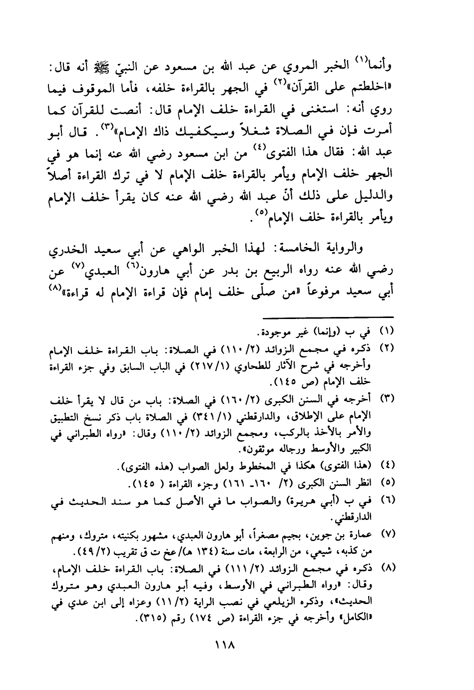 وأنما الْخَبَر الْمَرْوِيّ عَن عبد الله بن مَسْعُود عَن النَّبِي - صَلَّى اللَّهُ عَلَيْهِ وَسَلَّم َ - أَنه قَالَ: " اخلطتم على الْقُرْآن " فِي الْجَهْر بِالْقِرَاءَةِ خَلفه، فَأَما الْمَوْقُوف فِيمَا رُوِيَ أَنه: اسْتغنى فِي الْقِرَاءَة خلف الإِمَام قَالَ: أنصت لِلْقُرْآنِ كَمَا أمرت فَإِن فِي الصَّلَاة شغلا وسيكفيك ذَاك الإِمَام ". قَالَ أَبُو عبد الله: فَقَالَ هَذَا الْفَتْوَى من ابْن مَسْعُود رَضِي الله عَنهُ إِنَّمَا هُوَ فِي الْجَهْر خلف الإِمَام وَيَأْمُر بِالْقِرَاءَةِ خلف الإِمَام لَا فِي ترك الْقِرَاءَة أصلا وَالدَّلِيل على ذَلِك أَن عبد الله رَضِي الله عَنهُ كَانَ يقْرَأ خلف الإِمَام وَيَأْمُر بِالْقِرَاءَةِ خلف الإِمَام.