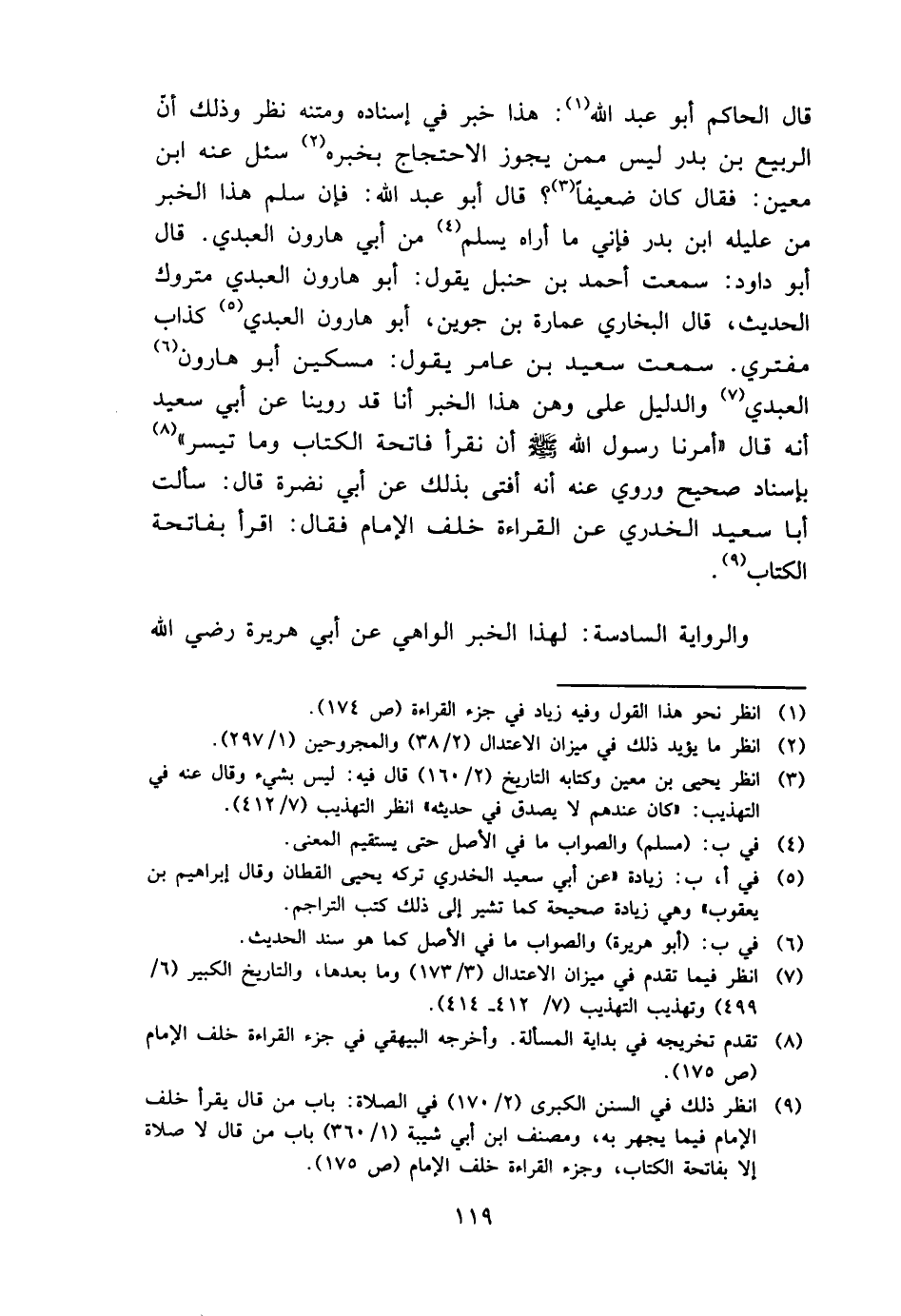 قَالَ الْحَاكِم أَبُو عبد الله: هَذَا خبر فِي إِسْنَاده وَمَتنه نظر وَذَلِكَ أَن الرّبيع بن بدر لَيْسَ مِمَّن يجوز الِاحْتِجَاج بِخَبَرِهِ سُئِلَ عَنهُ ابْن معِين: فَقَالَ كَانَ ضَعِيفا؟ قَالَ أَبُو عبد الله؟ فَإِن سلم هَذَا الْخَبَر من عليله ابْن بدر فَإِنِّي مَا أرَاهُ يسلم من أبي هَارُون الْعَبْدي. قَالَ أَبُو دَاوُد: سَمِعت أَحْمد بن حَنْبَل يَقُول: أَبُو هَارُون الْعَبْدي مَتْرُوك الحَدِيث، قَالَ البُخَارِيّ عمَارَة بن جُوَيْن، أَبُو هَارُون الْعَبْدي كَذَّاب مفتري. سَمِعت سعيد بن عَامر يَقُول: مِسْكين أَبُو هَارُون الْعَبْدي وَالدَّلِيل على وَهن هَذَا الْخَبَر أَنا قد روينَا عَن أبي سعيد أَنه قَالَ " أمرنَا رَسُول الله - صَلَّى اللَّهُ عَلَيْهِ وَسَلَّم َ - أَن نَقْرَأ بِفَاتِحَة الْكتاب وَمَا تيَسّر " بِإِسْنَاد صَحِيح وَرُوِيَ عَنهُ أَنه أفتى بذلك عَن أبي نَضرة قَالَ: سَأَلت أَبَا سعيد الْخُدْرِيّ عَن الْقِرَاءَة خلف الإِمَام فَقَالَ: اقْرَأ بِفَاتِحَة الْكتاب.