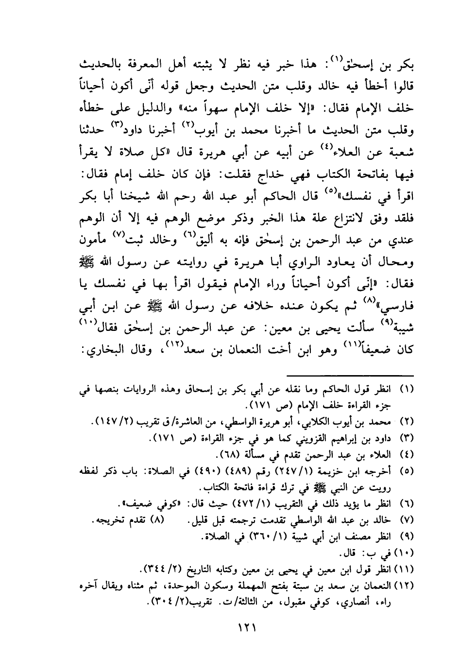 بكر بن إِسْحَق: هَذَا خبر فِيهِ نظر لَا يُثبتهُ أهل الْمعرفَة بِالْحَدِيثِ قَالُوا أَخطَأ فِيهِ خَالِد وقلب متن الحَدِيث وَجعل قَوْله أَنى أكون أَحْيَانًا خلف الإِمَام فَقَالَ: " إِلَّا خلف الإِمَام سَهوا مِنْهُ " وَالدَّلِيل على خطأه وقلب متن الحَدِيث مَا أخبرنَا مُحَمَّد بن أَيُّوب أخبرنَا دَاوُد حَدثنَا شُعْبَة عَن الْعَلَاء عَن أَبِيه عَن أبي هُرَيْرَة قَالَ " كل صَلَاة لَا يقْرَأ فِيهَا بِفَاتِحَة الْكتاب فَهِيَ خداج فَقلت: فَإِن كَانَ خلف إِمَام فَقَالَ: اقْرَأ فِي نَفسك " قَالَ الْحَاكِم أَبُو عبد الله رحم الله شَيخنَا أَبَا بكر فَلَقَد وفْق لانتزاع عِلّة هَذَا الْخَبَر وَذكر مَوضِع الْوَهم فِيهِ إِلَّا أَن الْوَهم عِنْدِي من عبد الرَّحْمَن بن إِسْحَق فَإِنَّهُ بِهِ أليق وخَالِد ثَبت مَأْمُون ومحال أَن يعاود الرَّاوِي أَبَا هُرَيْرَة فِي رِوَايَته عَن رَسُول الله - صَلَّى اللَّهُ عَلَيْهِ وَسَلَّم َ - فَقَالَ: " إِنِّي أكون أَحْيَانًا وَرَاء الإِمَام فَيَقُول اقْرَأ بهَا فِي نَفسك يَا فَارسي " ثمَّ يكون عِنْده خِلَافه عَن رَسُول الله - صَلَّى اللَّهُ عَلَيْهِ وَسَلَّم َ - عَن ابْن أبي شيبَة سَأَلت يحيى بن معِين: عَن عبد الرَّحْمَن بن إِسْحَق فَقَالَ كَانَ ضَعِيفا وَهُوَ ابْن أُخْت النُّعْمَان بن سعد، وَقَالَ البُخَارِيّ: