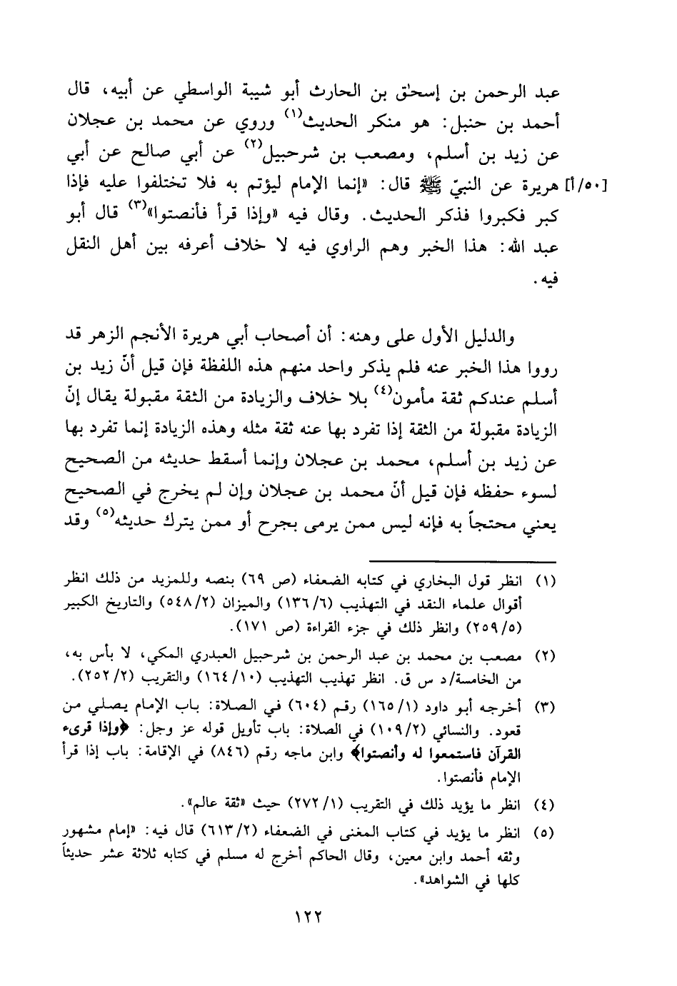 عبد الرَّحْمَن بن إِسْحَق بن الْحَارِث أَبُو شيبَة الوَاسِطِيّ عَن أَبِيه، قَالَ أَحْمد بن حَنْبَل: هُوَ مُنكر الحَدِيث وَرُوِيَ عَن مُحَمَّد بن عجلَان عَن زيد بن أسلم، وَمصْعَب بن شُرَحْبِيل عَن أبي صَالح عَن أبي هُرَيْرَة عَن النَّبِي - صَلَّى اللَّهُ عَلَيْهِ وَسَلَّم َ - قَالَ: " إِنَّمَا الإِمَام ليؤتم بِهِ فَلَا تختلفوا عَلَيْهِ فَإِذا كبر فكبروا فَذكر الحَدِيث. وَقَالَ فِيهِ " وَإِذا قَرَأَ فأنصتوا " قَالَ أَبُو عبد الله: هَذَا الْخَبَر وهم الرَّاوِي فِيهِ لَا خلاف أعرفهُ بَين أهل النَّقْل فِيهِ.