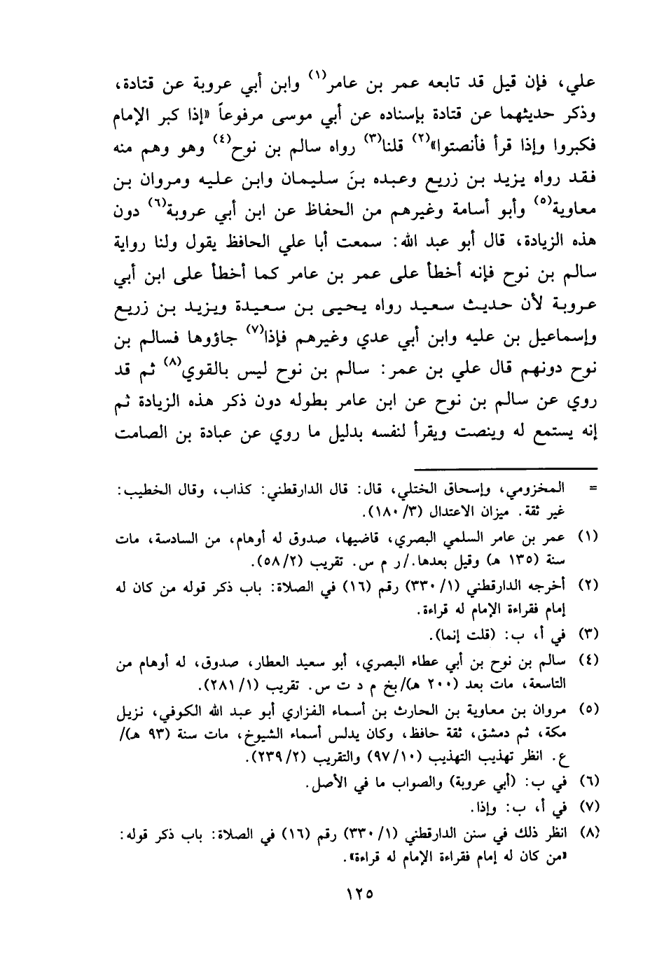 عَليّ، فَإِن قيل قد تَابعه عمر بن عَامر وَابْن أبي عرُوبَة عَن قَتَادَة، وَذكر حَدِيثهمَا عَن قَتَادَة بِإِسْنَادِهِ عَن أبي مُوسَى مَرْفُوعا " إِذا كبر الإِمَام فكبروا وَإِذا قَرَأَ فأنصتوا " قُلْنَا رَوَاهُ سَالم بن نوح وَهُوَ وهم مِنْهُ فقد رَوَاهُ يزِيد بن زُرَيْع وَعَبده بن سُلَيْمَان وَابْن عَلَيْهِ ومروان بن مُعَاوِيَة وَأَبُو أُسَامَة وَغَيرهم من الْحفاظ عَن ابْن أبي عرُوبَة دون هَذِه الزِّيَادَة، قَالَ أَبُو عبد الله: سَمِعت أَبَا عَليّ الْحَافِظ يَقُول وَلنَا رِوَايَة سَالم بن نوح فَإِنَّهُ أَخطَأ على عمر بن عَامر كَمَا أَخطَأ على ابْن أبي عرُوبَة لِأَن حَدِيث سعيد رَوَاهُ يحيى بن سعيدة وَيزِيد بن زُرَيْع وَإِسْمَاعِيل بن عَلَيْهِ وَابْن أبي عدي وَغَيرهم فَإِذا جاؤوها فسالم بن نوح دونهم قَالَ عَليّ بن عمر: سَالم بن نوح لَيْسَ بِالْقَوِيّ ثمَّ قد رُوِيَ عَن سَالم بن نوح عَن ابْن عَامر بِطُولِهِ دون ذكر هَذِه الزِّيَادَة ثمَّ إِنَّه يستمع لَهُ وينصت وَيقْرَأ لنَفسِهِ بِدَلِيل مَا رُوِيَ عَن عبَادَة بن الصَّامِت