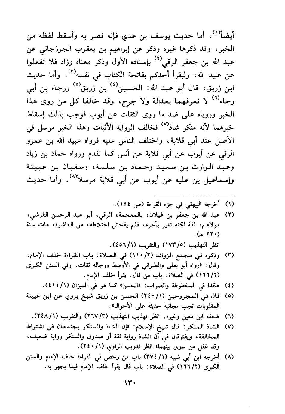 أَيْضا، أما حَدِيث يُوسُف بن عدي فَإِنَّهُ قصر بِهِ وَأسْقط لَفظه من الْخَبَر، وَقد ذكرهَا غَيره وَذكر عَن إِبْرَاهِيم بن يَعْقُوب الْجوزجَاني عَن عبد الله بن جَعْفَر الرقي بِإِسْنَادِهِ الأول وَذكر مَعْنَاهُ وَزَاد فَلَا تَفعلُوا عَن عبيد الله، وليقرأ أحدكُم بِفَاتِحَة الْكتاب فِي نَفسه. وَأما حَدِيث ابْن زُرَيْق، قَالَ أَبُو عبد الله: الْحُسَيْن بن زُرَيْق ورجاء بن أبي رَجَاء لَا نعرفهما بعدالة وَلَا جرح، وَقد خالفا كل من روى هَذَا الْخَبَر وروياه على ضد مَا روى الثِّقَات عَن أَيُّوب فَوَجَبَ بذلك إِسْقَاط خبرهما لِأَنَّهُ مُنكر شَاذ فَخَالف الرِّوَايَة الْأَثْبَات وَهَذَا الْخَبَر مُرْسل فِي الأَصْل عِنْد أبي قلَابَة، وَاخْتلف النَّاس عَلَيْهِ فَرَوَاهُ عبيد الله بن عَمْرو الرقي عَن أَيُّوب عَن أبي قلَابَة عَن أنس كَمَا تقدم وَرَوَاهُ حَمَّاد بن زِيَاد وَعبد الْوَارِث بن سعيد وَحَمَّاد بن سَلمَة، وسُفْيَان بن عُيَيْنَة وَإِسْمَاعِيل بن عَلَيْهِ عَن أَيُّوب عَن أبي قلَابَة مُرْسلا. وَأما حَدِيث
