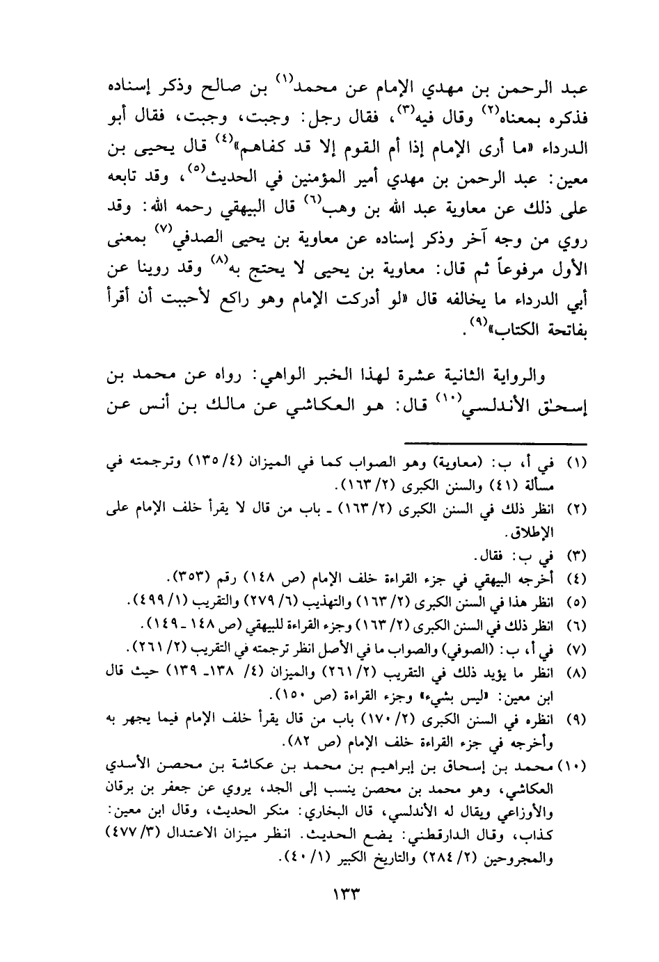 عبد الرَّحْمَن بن مهْدي الإِمَام عَن مُحَمَّد بن صَالح وَذكر إِسْنَاده فَذكره بِمَعْنَاهُ وَقَالَ فِيهِ، فَقَالَ رجل: وَجَبت، وَجَبت، فَقَالَ أَبُو الدَّرْدَاء " مَا أرى الإِمَام إِذا أم الْقَوْم إِلَّا قد كفاهم " قَالَ يحيى بن معِين: عبد الرَّحْمَن بن مهْدي أَمِير الْمُؤمنِينَ فِي الحَدِيث، وَقد تَابعه على ذَلِك عَن مُعَاوِيَة عبد الله بن وهب قَالَ الْبَيْهَقِيّ رَحمَه الله: وَقد رُوِيَ من وَجه آخر وَذكر إِسْنَاده عَن مُعَاوِيَة بن يحيى الصَّدَفِي بِمَعْنى الأول مَرْفُوعا ثمَّ قَالَ: مُعَاوِيَة بن يحيى لَا يحْتَج بِهِ وَقد روينَا عَن أبي الدَّرْدَاء مَا يُخَالِفهُ قَالَ " لَو أدْركْت الإِمَام وَهُوَ رَاكِع لأحببت أَن أَقرَأ بِفَاتِحَة الْكتاب ".
