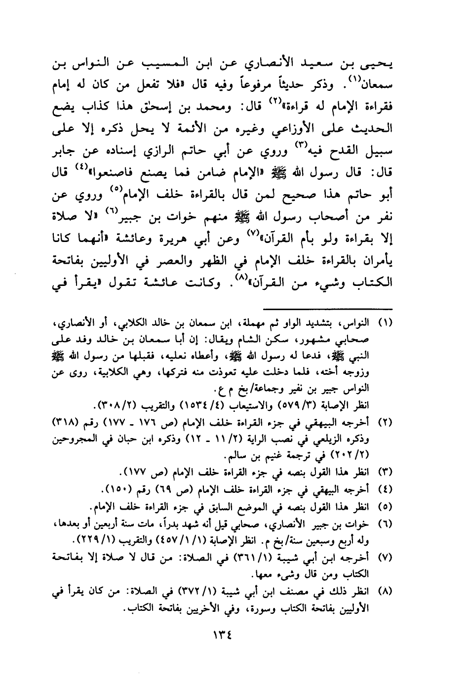 يحيى بن سعيد الْأنْصَارِيّ عَن ابْن الْمسيب عَن النواس بن سمْعَان. وَذكر حَدِيثا مَرْفُوعا وَفِيه قَالَ " فَلَا تفعل من كَانَ لَهُ إِمَام فقراءة الإِمَام لَهُ قِرَاءَة " قَالَ: وَمُحَمّد بن إِسْحَق هَذَا كَذَّاب يضع الحَدِيث على الْأَوْزَاعِيّ وَغَيره من الْأَئِمَّة لَا يحل ذكره إِلَّا على سَبِيل الْقدح فِيهِ وَرُوِيَ عَن أبي حَاتِم الرَّازِيّ إِسْنَاده عَن جَابر قَالَ: قَالَ رَسُول الله - صَلَّى اللَّهُ عَلَيْهِ وَسَلَّم َ - " الإِمَام ضَامِن فَمَا يصنع فَاصْنَعُوا " قَالَ أَبُو حَاتِم هَذَا صَحِيح لمن قَالَ بِالْقِرَاءَةِ خلف الإِمَام وَرُوِيَ عَن نفر من أَصْحَاب رَسُول الله - صَلَّى اللَّهُ عَلَيْهِ وَسَلَّم َ - مِنْهُم خَوات بن جُبَير " لَا صَلَاة إِلَّا بِقِرَاءَة وَلَو بِأم الْقُرْآن " وَعَن أبي هُرَيْرَة وَعَائِشَة " أَنَّهُمَا كَانَا يأمران بِالْقِرَاءَةِ خلف الإِمَام فِي الظّهْر وَالْعصر فِي الْأَوليين بِفَاتِحَة الْكتاب وَشَيْء من الْقُرْآن ". وَكَانَت عَائِشَة تَقول " يقْرَأ فِي