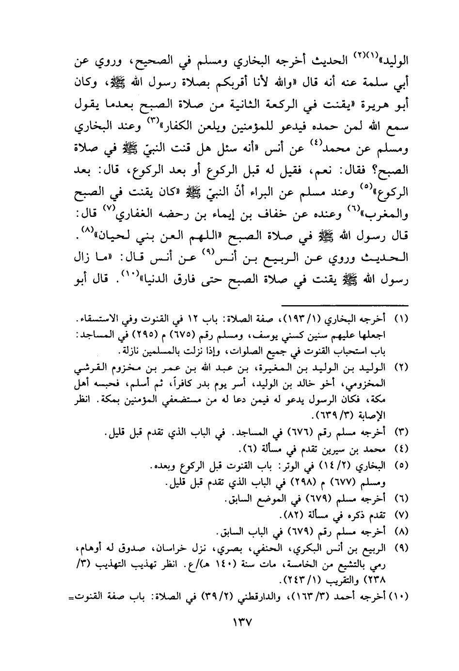 الْوَلِيد " الحَدِيث أخرجه البُخَارِيّ وَمُسلم فِي الصَّحِيح، وَرُوِيَ عَن أبي سَلمَة عَنهُ أَنه قَالَ " وَالله لأَنا أقربكم بِصَلَاة رَسُول الله - صَلَّى اللَّهُ عَلَيْهِ وَسَلَّم َ -، وَكَانَ أَبُو هُرَيْرَة " يقنت فِي الرَّكْعَة الثَّانِيَة من صَلَاة الصُّبْح بَعْدَمَا يَقُول سمع الله لمن حَمده فيدعو للْمُؤْمِنين ويلعن الْكفَّار " وَعند البُخَارِيّ وَمُسلم عَن مُحَمَّد عَن أنس " أَنه سُئِلَ هَل قنت النَّبِي - صَلَّى اللَّهُ عَلَيْهِ وَسَلَّم َ - فِي صَلَاة الصُّبْح؟ فَقَالَ: نعم، فَقيل لَهُ قبل الرُّكُوع أَو بعد الرُّكُوع، قَالَ: بعد الرُّكُوع " وَعند مُسلم عَن الْبَراء أَن النَّبِي - صَلَّى اللَّهُ عَلَيْهِ وَسَلَّم َ - " كَانَ يقنت فِي الصُّبْح وَالْمغْرب " وَعِنْده عَن خفاف بن إِيمَاء بن رحضه الْغِفَارِيّ قَالَ: قَالَ رَسُول الله - صَلَّى اللَّهُ عَلَيْهِ وَسَلَّم َ - فِي صَلَاة الصُّبْح " اللَّهُمَّ الْعَن بني لحيان " الحَدِيث وَرُوِيَ عَن الرّبيع بن أنس عَن أنس قَالَ: " مَا زَالَ رَسُول الله - صَلَّى اللَّهُ عَلَيْهِ وَسَلَّم َ - يقنت فِي صَلَاة الصُّبْح حَتَّى فَارق الدُّنْيَا ". قَالَ أَبُو