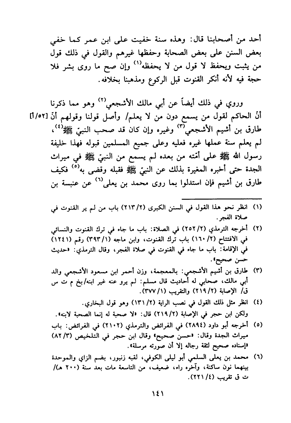 أحد من أَصْحَابنَا قَالَ: وَهَذِه سنة خفيت على ابْن عمر كَمَا خَفِي بعض السّنَن على بعض الصَّحَابَة وحفظها غَيرهم وَالْقَوْل فِي ذَلِك قَول من يثبت ويحفظ لَا قَول من لَا يحفظه وَإِن صَحَّ مَا روى بشر فَلَا حجَّة فِيهِ لِأَنَّهُ أنكر الْقُنُوت قبل الرُّكُوع ومذهبنا بِخِلَافِهِ.