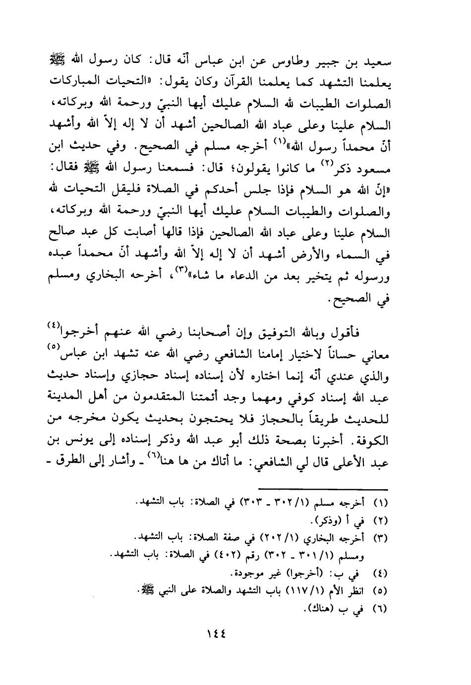 فَأَقُول وَبِاللَّهِ التَّوْفِيق وَإِن أَصْحَابنَا رَضِي الله عَنْهُم أخرجُوا مَعَاني حسانا لاختيار إمامنا الشَّافِعِي رَضِي الله عَنهُ تشهد ابْن عَبَّاس وَالَّذِي عِنْدِي أَنه إِنَّمَا اخْتَارَهُ لِأَن إِسْنَاده إِسْنَاد حجازي وَإسْنَاد حَدِيث عبد الله إِسْنَاد كُوفِي وَمهما وجد أَئِمَّتنَا المتقدمون من أهل الْمَدِينَة للْحَدِيث طَرِيقا بالحجاز فَلَا يحتجون بِحَدِيث يكون مخرجه من الْكُوفَة. أخبرنَا بِصِحَّة ذَلِك أَبُو عبد الله وَذكر إِسْنَاده إِلَى يُونُس بن عبد الْأَعْلَى قَالَ لي الشَّافِعِي: مَا أَتَاك من هَا هُنَا - وَأَشَارَ إِلَى الطّرق -