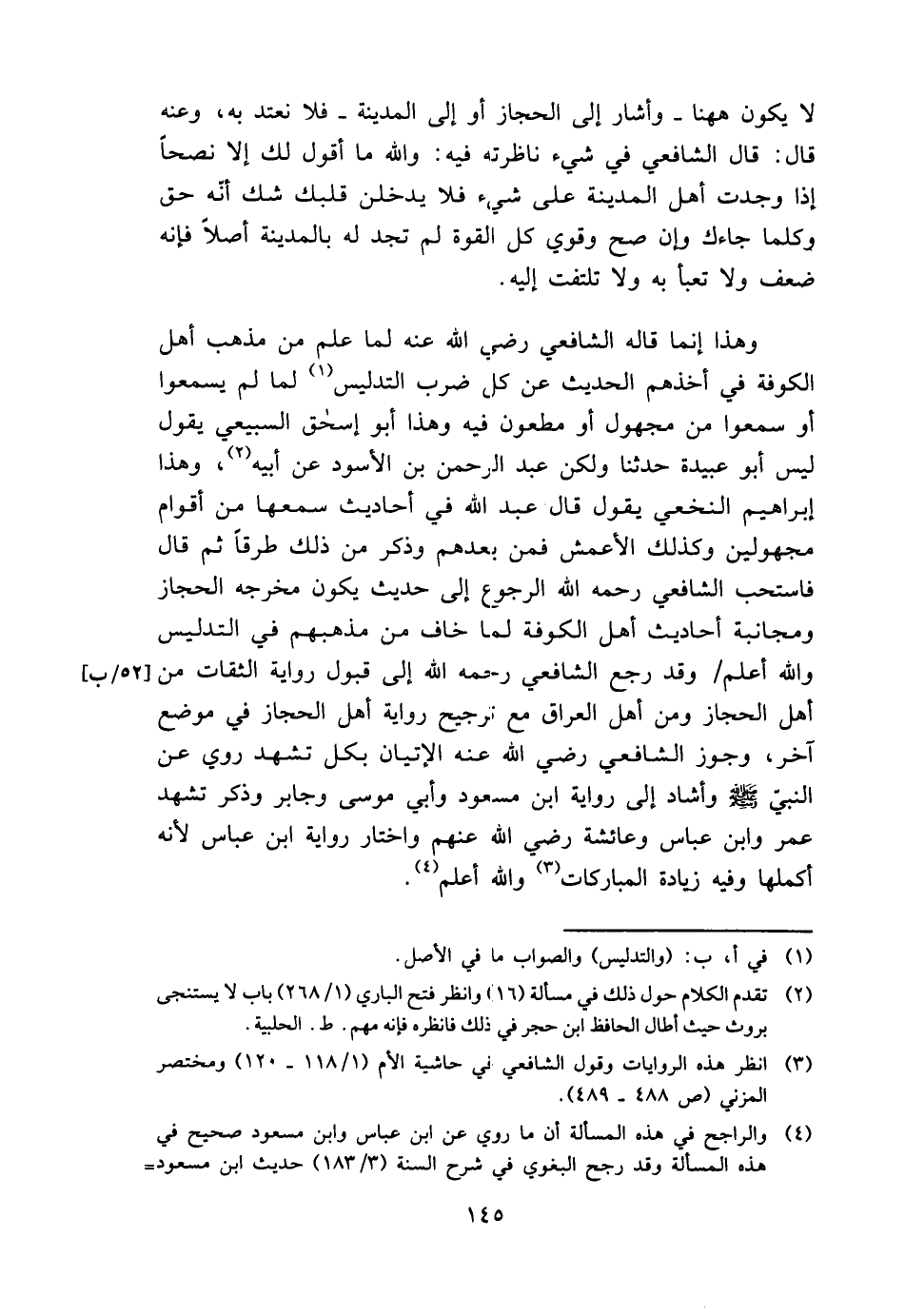 وَهَذَا إِنَّمَا قَالَه الشَّافِعِي رَضِي الله عَنهُ لما علم من مَذْهَب أهل الْكُوفَة فِي أَخذهم الحَدِيث عَن كل ضرب التَّدْلِيس لما لم يسمعوا أَو سمعُوا من مَجْهُول أَو مطعون فِيهِ وَهَذَا أَبُو إِسْحَق السبيعِي يَقُول لَيْسَ أَبُو عُبَيْدَة حَدثنَا وَلَكِن عبد الرَّحْمَن بن الْأسود عَن أَبِيه، وَهَذَا إِبْرَاهِيم النَّخعِيّ يَقُول قَالَ عبد الله فِي أَحَادِيث سَمعهَا من أَقوام مجهولين وَكَذَلِكَ الْأَعْمَش فَمن بعدهمْ وَذكر من ذَلِك طرقا ثمَّ قَالَ فاستحب الشَّافِعِي رَحمَه الله الرُّجُوع إِلَى حَدِيث يكون مخرجه الْحجاز ومجانبة أَحَادِيث أهل الْكُوفَة لما خَافَ من مَذْهَبهم فِي التَّدْلِيس وَالله أعلم / وَقد رَجَعَ الشَّافِعِي رَحمَه الله إِلَى قبُول رِوَايَة الثِّقَات من أهل الْحجاز وَمن أهل الْعرَاق مَعَ تَرْجِيح رِوَايَة أهل الْحجاز فِي مَوضِع آخر، وَجوز الشَّافِعِي رَضِي الله عَنهُ الْإِتْيَان بِكُل تشهد رُوِيَ عَن النَّبِي - صَلَّى اللَّهُ عَلَيْهِ وَسَلَّم َ - وأشاد إِلَى رِوَايَة ابْن مَسْعُود وَأبي مُوسَى وَجَابِر وَذكر تشهد عمر وَابْن عَبَّاس وَعَائِشَة رَضِي الله عَنْهُم وَاخْتَارَ رِوَايَة ابْن عَبَّاس لِأَنَّهُ أكملها وَفِيه زِيَادَة المباركات وَالله أعلم.