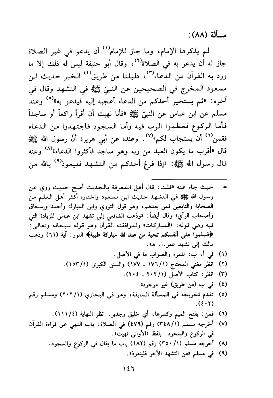 لم يذكرهَا الإِمَام، وَمَا جَازَ للْإِمَام أَن يَدْعُو فِي غير الصَّلَاة جَازَ لَهُ أَن يَدْعُو بِهِ فِي الصَّلَاة، وَقَالَ أَبُو حنيفَة لَيْسَ لَهُ ذَلِك إِلَّا مَا ورد بِهِ الْقُرْآن من الدُّعَاء، دليلنا من طَرِيق الْخَبَر حَدِيث ابْن مَسْعُود الْمخْرج فِي الصَّحِيحَيْنِ عَن النَّبِي - صَلَّى اللَّهُ عَلَيْهِ وَسَلَّم َ - فِي التَّشَهُّد وَقَالَ فِي آخِره: " ثمَّ يستخير أحدكُم من الدُّعَاء أعجبه إِلَيْهِ فيدعو بِهِ " وَعند مُسلم عَن ابْن عَبَّاس عَن النَّبِي - صَلَّى اللَّهُ عَلَيْهِ وَسَلَّم َ - " فَأَنا نهيت أَن أَقرَأ رَاكِعا أَو سَاجِدا فَأَما الرُّكُوع فَعَظمُوا الرب فِيهِ وَأما السُّجُود فاجتهدوا من الدُّعَاء فقمن أَن يُسْتَجَاب لكم ". وَعِنْده عَن أبي هُرَيْرَة أَن رَسُول الله - صَلَّى اللَّهُ عَلَيْهِ وَسَلَّم َ - قَالَ " أقرب مَا يكون العَبْد من ربه وَهُوَ ساجد فَأَكْثرُوا الدُّعَاء " وَعنهُ قَالَ رَسُول الله - صَلَّى اللَّهُ عَلَيْهِ وَسَلَّم َ -: " إِذا فرغ أحدكُم من التَّشَهُّد فليعوذ بِاللَّه من