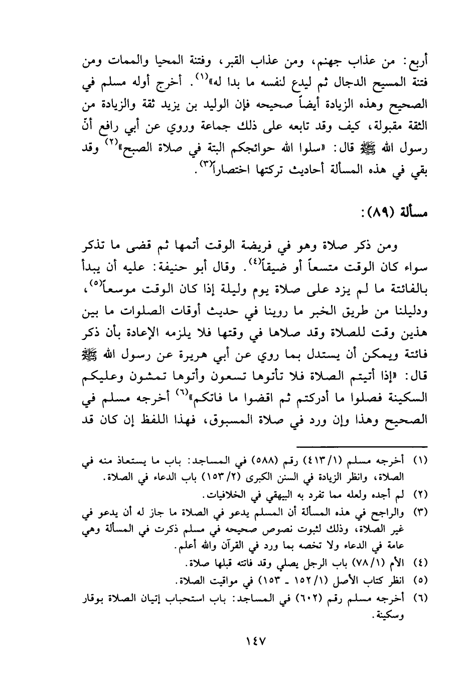 أَربع: من عَذَاب جَهَنَّم، وَمن عَذَاب الْقَبْر، وفتنة الْمحيا وَالْمَمَات وَمن فتْنَة الْمَسِيح الدَّجَّال ثمَّ ليَدع لنَفسِهِ مَا بدا لَهُ ". أخرج أَوله مُسلم فِي الصَّحِيح وَهَذِه الزِّيَادَة أَيْضا صَحِيحه فَإِن الْوَلِيد بن يزِيد ثِقَة وَالزِّيَادَة من الثِّقَة مَقْبُولَة، كَيفَ وَقد تَابعه على ذَلِك جمَاعَة وَرُوِيَ عَن أبي رَافع أَن رَسُول الله - صَلَّى اللَّهُ عَلَيْهِ وَسَلَّم َ - قَالَ: " سلوا الله حَوَائِجكُمْ الْبَتَّةَ فِي صَلَاة الصُّبْح " وَقد بَقِي فِي هَذِه الْمَسْأَلَة أَحَادِيث تركتهَا اختصارا.