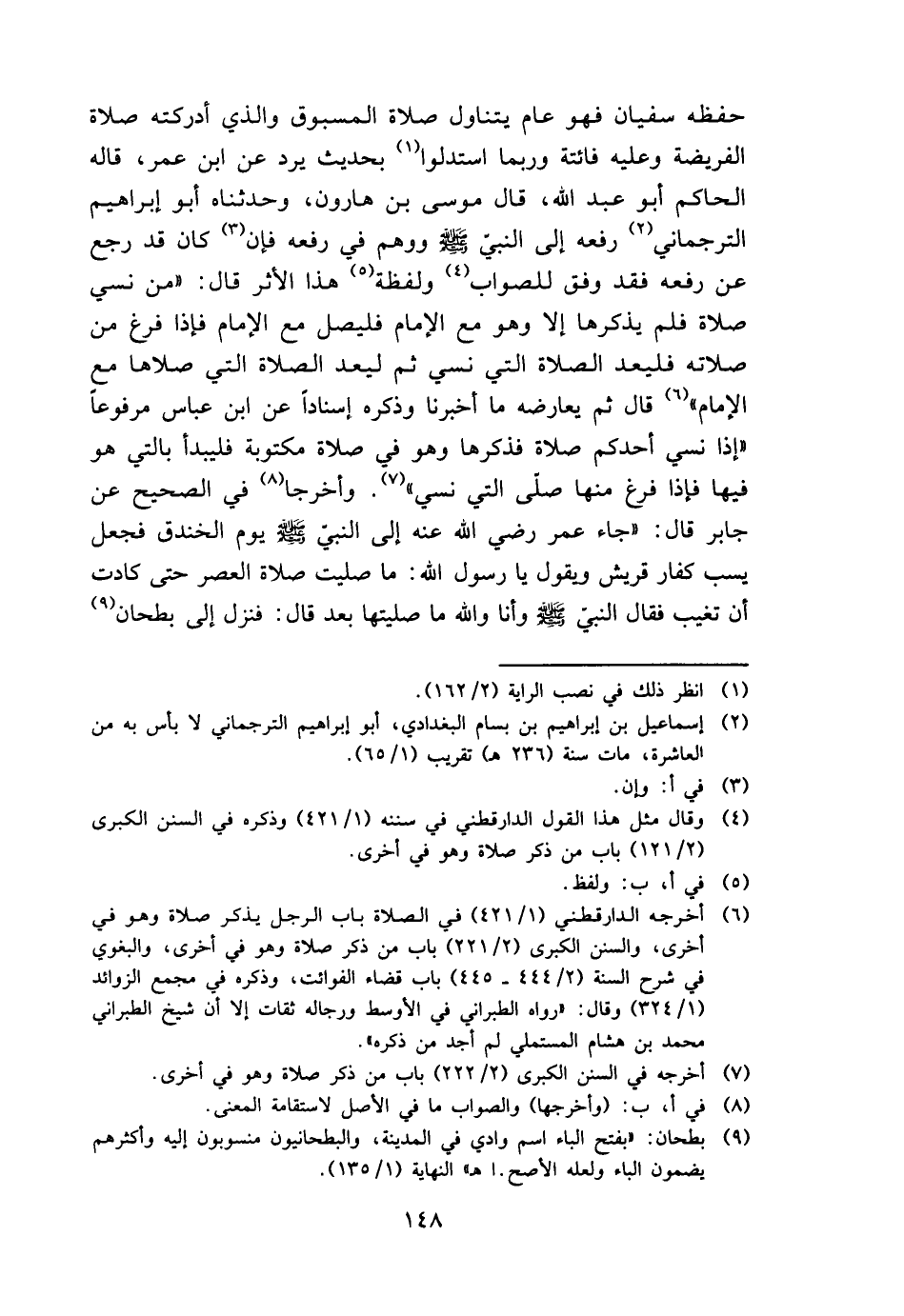 حفظه سُفْيَان فَهُوَ عَام يتَنَاوَل صَلَاة الْمَسْبُوق وَالَّذِي أَدْرَكته صَلَاة الْفَرِيضَة وَعَلِيهِ فَائِتَة وَرُبمَا استدلوا بِحَدِيث يرد عَن ابْن عمر، قَالَه الْحَاكِم أَبُو عبد الله، قَالَ مُوسَى بن هَارُون، وحدثناه أَبُو إِبْرَاهِيم الترجماني رَفعه إِلَى النَّبِي - صَلَّى اللَّهُ عَلَيْهِ وَسَلَّم َ - وَوهم فِي رَفعه فَإِن كَانَ قد رَجَعَ عَن رَفعه فقد وفْق للصَّوَاب وَلَفْظَة هَذَا الْأَثر قَالَ: " من نسي صَلَاة فَلم يذكرهَا إِلَّا وَهُوَ مَعَ الإِمَام فَليصل مَعَ الإِمَام فَإِذا فرغ من صلَاته فليعد الصَّلَاة الَّتِي نسي ثمَّ ليعد الصَّلَاة الَّتِي صلاهَا مَعَ الإِمَام " قَالَ ثمَّ يُعَارضهُ مَا أخبرنَا وَذكره إِسْنَادًا عَن ابْن عَبَّاس مَرْفُوعا " إِذا نسي أحدكُم صَلَاة فَذكرهَا وَهُوَ فِي صَلَاة مَكْتُوبَة فليبدأ بِالَّتِي هُوَ فِيهَا فَإِذا فرغ مِنْهَا صلى الَّتِي نسي ". وَأَخْرَجَا فِي الصَّحِيح عَن جَابر قَالَ: " جَاءَ عمر رَضِي الله عَنهُ إِلَى النَّبِي - صَلَّى اللَّهُ عَلَيْهِ وَسَلَّم َ - يَوْم الخَنْدَق فَجعل يسب كفار قُرَيْش وَيَقُول يَا رَسُول الله: مَا صليت صَلَاة الْعَصْر حَتَّى كَادَت أَن تغيب فَقَالَ النَّبِي - صَلَّى اللَّهُ عَلَيْهِ وَسَلَّم َ - وَأَنا وَالله مَا صليتها بعد قَالَ: فَنزل إِلَى بطحان