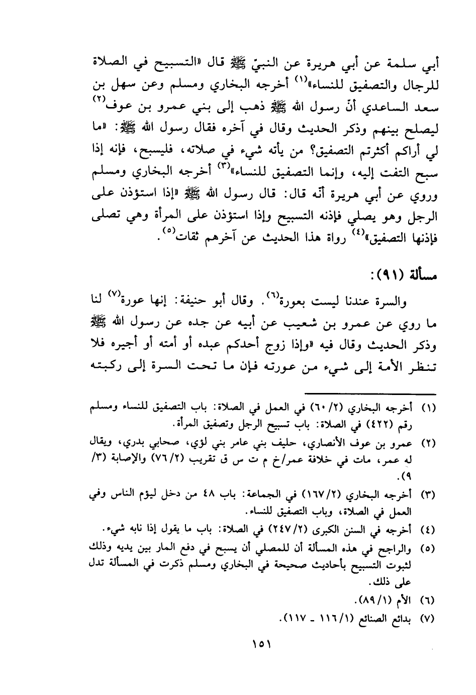أبي سَلمَة عَن أبي هُرَيْرَة عَن النَّبِي - صَلَّى اللَّهُ عَلَيْهِ وَسَلَّم َ - قَالَ " التَّسْبِيح فِي الصَّلَاة للرِّجَال والتصفيق للنِّسَاء " أخرجه البُخَارِيّ وَمُسلم وَعَن سهل بن سعد السَّاعِدِيّ أَن رَسُول الله - صَلَّى اللَّهُ عَلَيْهِ وَسَلَّم َ - ذهب إِلَى بني عَمْرو بن عَوْف ليصلح بَينهم وَذكر الحَدِيث وَقَالَ فِي آخِره فَقَالَ رَسُول الله - صَلَّى اللَّهُ عَلَيْهِ وَسَلَّم َ -: " مَا لي أَرَاكُم أَكثرْتُم التصفيق؟ من يَأْته شَيْء فِي صلَاته، فليسبح، فَإِنَّهُ إِذا سبح الْتفت إِلَيْهِ، وَإِنَّمَا التصفيق للنِّسَاء " أخرجه البُخَارِيّ وَمُسلم وَرُوِيَ عَن أبي هُرَيْرَة أَنه قَالَ: قَالَ رَسُول الله - صَلَّى اللَّهُ عَلَيْهِ وَسَلَّم َ - " إِذا استؤذن على الرجل وَهُوَ يُصَلِّي فإذنه التَّسْبِيح وَإِذا استؤذن على الْمَرْأَة وَهِي تصلي فإذنها التصفيق " رُوَاة هَذَا الحَدِيث عَن آخِرهم ثِقَات.