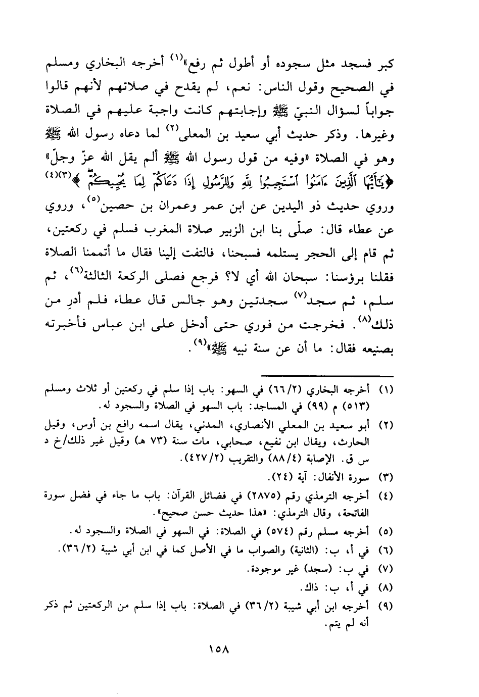كبر فَسجدَ مثل سُجُوده أَو أطول ثمَّ رفع " أخرجه البُخَارِيّ وَمُسلم فِي الصَّحِيح وَقَول النَّاس: نعم، لم يقْدَح فِي صلَاتهم لأَنهم قَالُوا جَوَابا لسؤال النَّبِي - صَلَّى اللَّهُ عَلَيْهِ وَسَلَّم َ - وإجابتهم كَانَت وَاجِبَة عَلَيْهِم فِي الصَّلَاة وَغَيرهَا. وَذكر حَدِيث أبي سعيد بن الْمُعَلَّى لما دَعَاهُ رَسُول الله - صَلَّى اللَّهُ عَلَيْهِ وَسَلَّم َ - وَهُوَ فِي الصَّلَاة " وَفِيه من قَول رَسُول الله - صَلَّى اللَّهُ عَلَيْهِ وَسَلَّم َ - ألم يَقُول الله عز وَجل " {يَا أَيهَا الَّذين آمنُوا اسْتجِيبُوا لله وَلِلرَّسُولِ إِذا دعَاكُمْ لما يُحْيِيكُمْ} وَرُوِيَ حَدِيث ذُو الْيَدَيْنِ عَن ابْن عمر وَعمْرَان بن حُصَيْن، وَرُوِيَ عَن عَطاء قَالَ: صلى بِنَا ابْن الزبير صَلَاة الْمغرب فَسلم فِي رَكْعَتَيْنِ، ثمَّ قَامَ إِلَى الْحجر يستلمه فسبحنا، فَالْتَفت إِلَيْنَا فَقَالَ مَا أتممنا الصَّلَاة فَقُلْنَا برؤسنا: سُبْحَانَ الله أَي لَا؟ فَرجع فصلى الرَّكْعَة الثَّالِثَة، ثمَّ سلم، ثمَّ سجد سَجْدَتَيْنِ وَهُوَ جَالس قَالَ عَطاء فَلم أدر من ذَلِك. فَخرجت من فوري حَتَّى أَدخل على ابْن عَبَّاس فَأَخْبَرته بصنيعه فَقَالَ: مَا أَن عَن سنة نبيه - صَلَّى اللَّهُ عَلَيْهِ وَسَلَّم َ - ".
