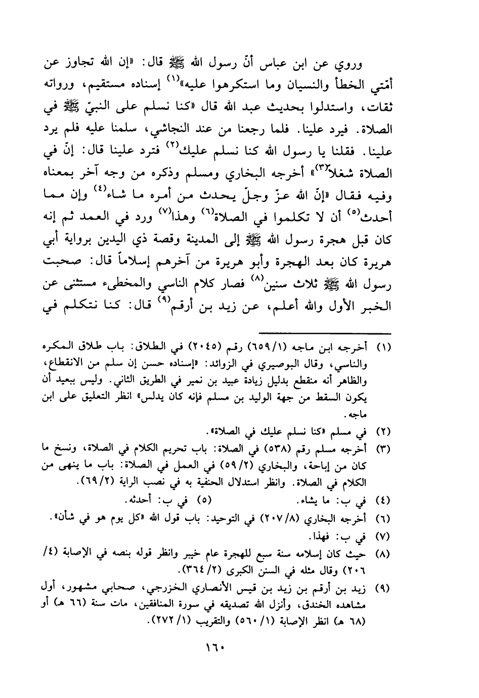 وَرُوِيَ عَن ابْن عَبَّاس أَن رَسُول الله - صَلَّى اللَّهُ عَلَيْهِ وَسَلَّم َ - قَالَ: " إِن الله تجَاوز عَن أمتِي الْخَطَأ وَالنِّسْيَان وَمَا اسْتكْرهُوا عَلَيْهِ " إِسْنَاده مُسْتَقِيم، وَرُوَاته ثِقَات، وَاسْتَدَلُّوا بِحَدِيث عبد الله قَالَ " كُنَّا نسلم على النَّبِي - صَلَّى اللَّهُ عَلَيْهِ وَسَلَّم َ - فِي الصَّلَاة. فَيرد علينا. فَلَمَّا رَجعْنَا من عِنْد النَّجَاشِيّ، سلمنَا عَلَيْهِ فَلم يرد علينا. فَقُلْنَا يَا رَسُول الله كُنَّا نسلم عَلَيْك فَترد علينا قَالَ: إِن فِي الصَّلَاة شغلا " أخرجه البُخَارِيّ وَمُسلم وَذكره من وَجه آخر بِمَعْنَاهُ وَفِيه فَقَالَ " إِن الله عز وَجل يحدث من أمره مَا شَاءَ وَإِن مِمَّا أحدث أَن لَا تكلمُوا فِي الصَّلَاة وَهَذَا ورد فِي الْعمد ثمَّ إِنَّه كَانَ قبل هِجْرَة رَسُول الله - صَلَّى اللَّهُ عَلَيْهِ وَسَلَّم َ - إِلَى الْمَدِينَة وقصة ذِي الْيَدَيْنِ بِرِوَايَة أبي هُرَيْرَة كَانَ بعد الْهِجْرَة وَأَبُو هُرَيْرَة من آخِرهم إسلاما قَالَ: صَحِبت رَسُول الله - صَلَّى اللَّهُ عَلَيْهِ وَسَلَّم َ - ثَلَاث سِنِين فَصَارَ كَلَام النَّاسِي والمخطئ مُسْتَثْنى عَن الْخَبَر الأول وَالله أعلم، عَن زيد بن أَرقم قَالَ: كُنَّا نتكلم فِي