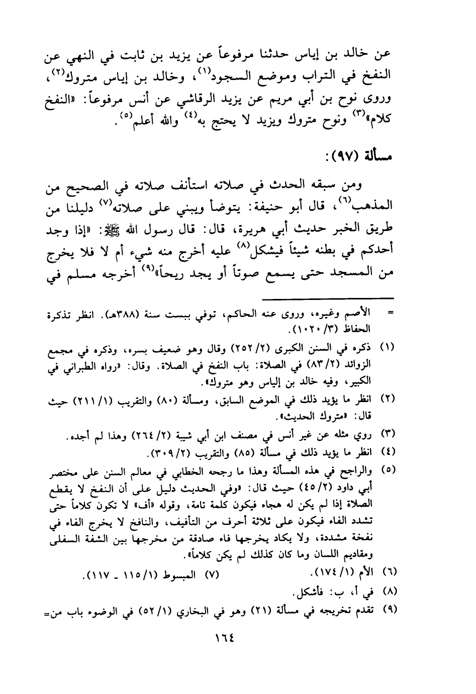 عَن خَالِد بن إِيَاس حَدثنَا مَرْفُوعا عَن يزِيد بن ثَابت فِي النَّهْي عَن النفخ فِي التُّرَاب وَمَوْضِع السُّجُود وخَالِد بن إِيَاس مَتْرُوك، وروى نوح بن أبي مَرْيَم عَن يزِيد الرقاشِي عَن أنس مَرْفُوعا: " النفخ كَلَام " ونوح مَتْرُوك وَيزِيد لَا يحْتَج بِهِ وَالله أعلم.