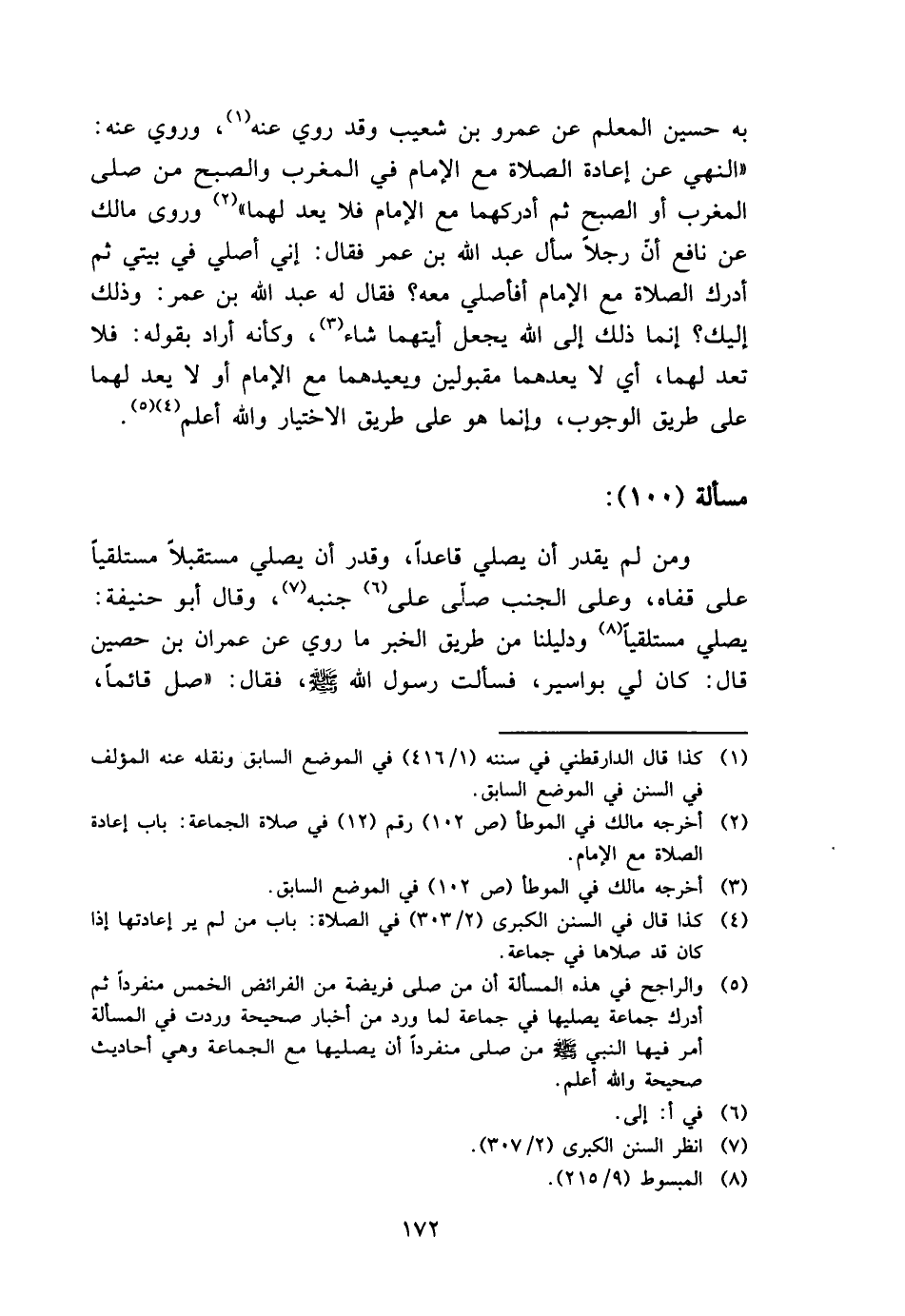 بِهِ حُسَيْن الْمعلم عَن عَمْرو بن شُعَيْب وَقد رُوِيَ عَنهُ، وَرُوِيَ عَنهُ: " النَّهْي عَن إِعَادَة الصَّلَاة مَعَ الإِمَام فِي الْمغرب وَالصُّبْح من صلى الْمغرب أَو الصُّبْح ثمَّ أدركهما مَعَ الإِمَام فَلَا يعد لَهما " وروى مَالك عَن نَافِع أَن رجلا سَأَلَ عبد الله بن عمر فَقَالَ: إِنِّي أُصَلِّي فِي بَيْتِي ثمَّ أدْرك الصَّلَاة مَعَ الإِمَام أفأصلي مَعَه؟ فَقَالَ لَهُ عبد الله بن عمر: وَذَلِكَ إِلَيْك؟ إِنَّمَا ذَلِك إِلَى الله يَجْعَل أَيَّتهمَا شَاءَ، وَكَأَنَّهُ أَرَادَ بقوله: فَلَا تعد لَهما، أَي لَا يعدهما مقبولين ويعيدهما مَعَ الإِمَام أَو لَا يعد لَهما على طَرِيق الْوُجُوب، وَإِنَّمَا هُوَ على طَرِيق الِاخْتِيَار وَالله أعلم.