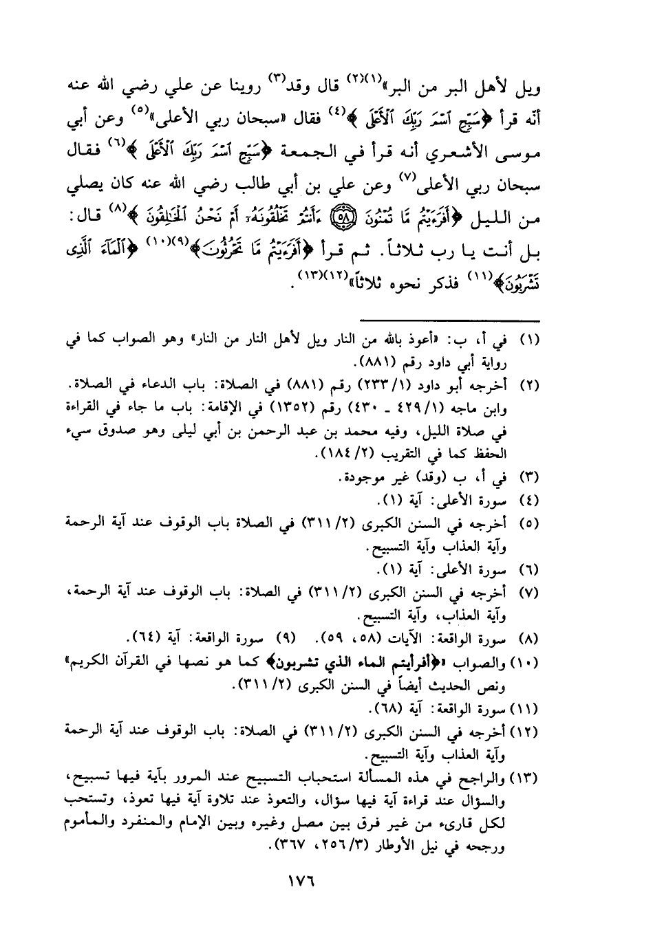 ويل لأه الْبر من الْبر " قَالَ وَقد ورينا عَن عَليّ رَضِي الله عَنهُ أَنه قَرَأَ {سبح اسْم رَبك الْأَعْلَى} فَقَالَ " سُبْحَانَ رَبِّي الْأَعْلَى " وَعَن أبي مُوسَى الْأَشْعَرِيّ أَنه قَرَأَ فِي أجمعة {سبح اسْم رَبك الْأَعْلَى} فَقَالَ سُبْحَانَ رَبِّي الْأَعْلَى وَعَن عَليّ بن أبي طَالب رَضِي الله عَنهُ كَانَ يُصَلِّي من اللَّيْل {أفرءيتم مَا تمنون (58) ءأنتم تخلقونه أم نَحن الْخَالِقُونَ} قَالَ: بل أَنْت يَا رب ثَلَاثًا. ثمَّ قَرَأَ {أفرءيتم مَا تَحْرُثُونَ} {المَاء الَّذِي تشربون} فَذكر نَحوه ثَلَاثًا ".