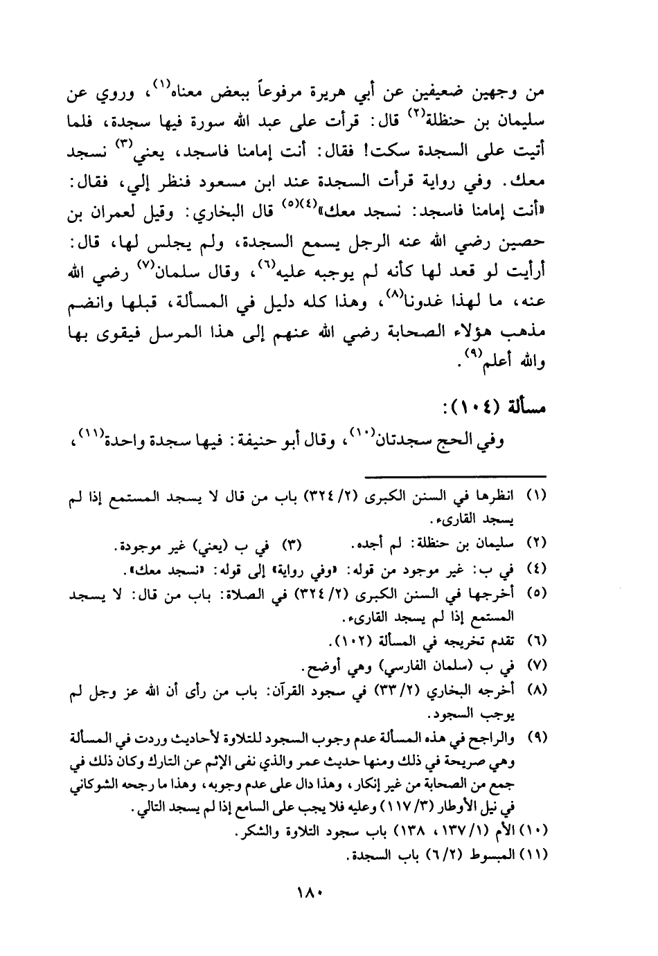 من وَجْهَيْن ضعيفين عَن أبي هُرَيْرَة مَرْفُوعا بِبَعْض مَعْنَاهُ، وَرُوِيَ عَن سُلَيْمَان بن حَنْظَلَة قَالَ: قَرَأت على عبد الله سُورَة فِيهَا سَجْدَة، فَلَمَّا أتيت على السَّجْدَة سكت! فَقَالَ: أَنْت إمامنا فاسجد، يَعْنِي نسجد مَعَك. وَفِي رِوَايَة قَرَأت السَّجْدَة عِنْد ابْن مَسْعُود فَنظر إِلَيّ، فَقَالَ: " أَنْت إمامنا فاسجد: نسجد مَعَك " قَالَ البُخَارِيّ: وَقيل لعمران بن حُصَيْن رَضِي الله عَنهُ الرجل يسمع السَّجْدَة، وَلم يجلس لَهَا، قَالَ: أَرَأَيْت لَو قعد لَهَا كَأَنَّهُ لم يُوجِبهُ عَلَيْهِ، وَقَالَ سلمَان رَضِي الله عَنهُ، مَا لهَذَا غدونا، وَهَذَا كُله دَلِيل فِي الْمَسْأَلَة، قبلهَا وانضم مَذْهَب هَؤُلَاءِ الصَّحَابَة رَضِي الله عَنْهُم إِلَى هَذَا الْمُرْسل فيقوى بهَا وَالله أعلم.