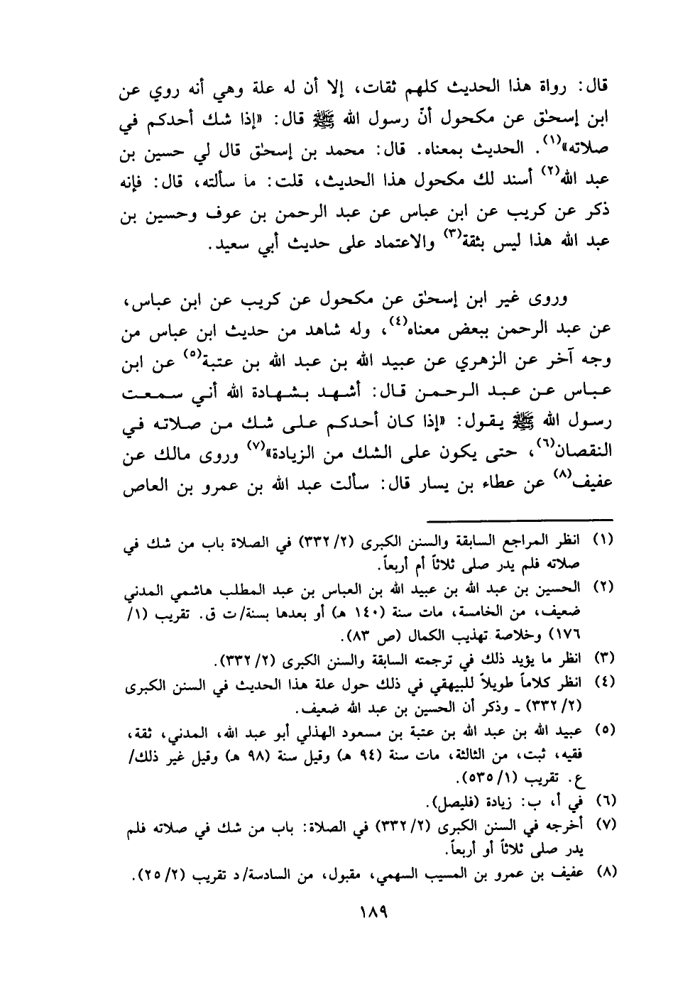 قَالَ: رُوَاة هَذَا الحَدِيث كلهم ثِقَات، إِلَّا أَن لَهُ عِلّة وَهِي أَنه رُوِيَ عَن ابْن إِسْحَق عَن مَكْحُول أَن رَسُول الله - صَلَّى اللَّهُ عَلَيْهِ وَسَلَّم َ - قَالَ: " إِذا شكّ أحدكُم فِي صلَاته ". الحَدِيث بِمَعْنَاهُ. قَالَ: مُحَمَّد بن إِسْحَق قَالَ لي حُسَيْن بن عبد الله أسْند لَك مَكْحُول هَذَا الحَدِيث، قلت: مَا سَأَلته، قَالَ: فَإِنَّهُ ذكر عَن كريب عَن ابْن عَبَّاس عَن عبد الرَّحْمَن بن عَوْف وحسين بن عبد الله هَذَا لَيْسَ بِثِقَة والاعتماد على حَدِيث أبي سعيد.