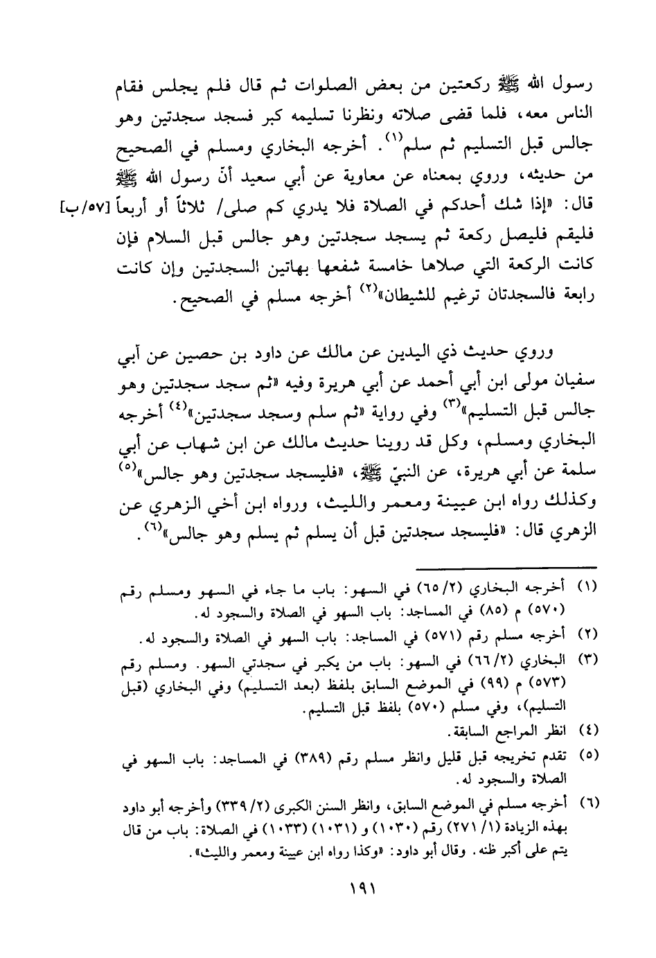 رَسُول الله - صَلَّى اللَّهُ عَلَيْهِ وَسَلَّم َ - رَكْعَتَيْنِ من بعض الصَّلَوَات ثمَّ قَالَ فَلم يجلس فَقَامَ النَّاس مَعَه، فَلَمَّا قضى صلَاته ونظرنا تَسْلِيمه كبر فَسجدَ سَجْدَتَيْنِ وَهُوَ جَالس قبل التَّسْلِيم ثمَّ سلم. أخرجه البُخَارِيّ وَمُسلم فِي الصَّحِيح من حَدِيثه، وَرُوِيَ بِمَعْنَاهُ عَن مُعَاوِيَة عَن أبي سعيد أَن رَسُول الله - صَلَّى اللَّهُ عَلَيْهِ وَسَلَّم َ - قَالَ: " إِذا شكّ أحدكُم فِي الصَّلَاة فَلَا يدْرِي كم صلى / ثَلَاثًا أَو أَرْبعا فَليقمْ فَليصل رَكْعَة ثمَّ يسْجد سَجْدَتَيْنِ وَهُوَ جَالس قبل السَّلَام فَإِن كَانَت الرَّكْعَة الَّتِي صلاهَا خَامِسَة شفعها بِهَاتَيْنِ السَّجْدَتَيْنِ وَإِن كَانَت رَابِعَة فالسجدتان ترغيم للشَّيْطَان " أخرجه مُسلم فِي الصَّحِيح.