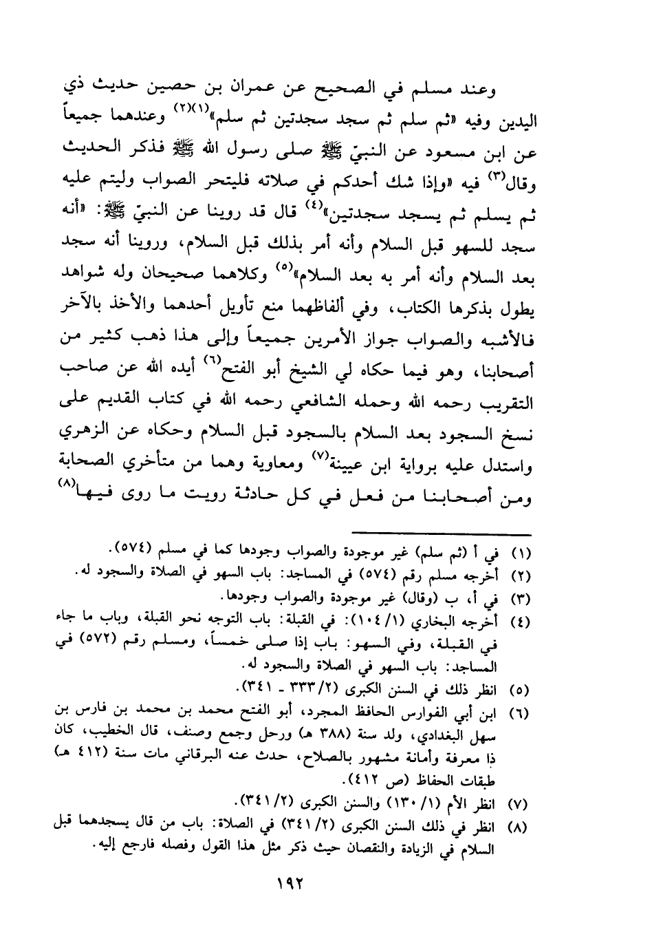 وَعند مُسلم فِي الصَّحِيح عَن عمرَان بن حُصَيْن حَدِيث ذِي الْيَدَيْنِ وَفِيه " ثمَّ سلم ثمَّ سجد سَجْدَتَيْنِ ثمَّ سلم " وَعِنْدَهُمَا جَمِيعًا عَن ابْن مَسْعُود عَن النَّبِي - صَلَّى اللَّهُ عَلَيْهِ وَسَلَّم َ - صلى رَسُول الله - صَلَّى اللَّهُ عَلَيْهِ وَسَلَّم َ - فَذكر الحَدِيث وَقَالَ فِيهِ " وَإِذا شكّ أحدكُم فِي صلَاته فليتحر الصَّوَاب وليتم عَلَيْهِ ثمَّ يسلم ثمَّ يسْجد سَجْدَتَيْنِ " قَالَ قد روينَا عَن النَّبِي - صَلَّى اللَّهُ عَلَيْهِ وَسَلَّم َ -: " أَنه سجد للسَّهْو قبل السَّلَام وَأَنه أَمر بذلك قبل السَّلَام، وروينا أَنه سجد بعد السَّلَام وَأَنه أَمر بِهِ بعد السَّلَام " وَكِلَاهُمَا صَحِيحَانِ وَله شَوَاهِد يطول بذكرها الْكتاب، وَفِي ألفاظهما منع تَأْوِيل أَحدهمَا وَالْأَخْذ بِالْآخرِ فالأشبه وَالصَّوَاب جَوَاز الْأَمريْنِ جَمِيعًا وَإِلَى هَذَا ذهب كثير من أَصْحَابنَا، وَهُوَ فِيمَا حَكَاهُ لي الشَّيْخ أَبُو الْفَتْح أيده الله عَن صَاحب التَّقْرِيب رَحمَه الله وَحمله الشَّافِعِي رَحمَه الله فِي كتاب الْقَدِيم على نسخ السُّجُود بعد السَّلَام بِالسُّجُود قبل السَّلَام وَحَكَاهُ عَن الزُّهْرِيّ وَاسْتدلَّ عَلَيْهِ بِرِوَايَة ابْن عُيَيْنَة وَمُعَاوِيَة وهما من متأخري الصَّحَابَة وَمن أَصْحَابنَا من فعل فِي كل حَادِثَة رويت مَا روى فِيهَا