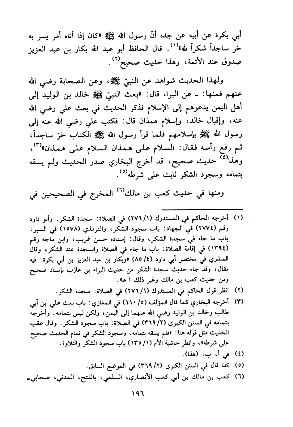أبي بكرَة عَن أَبِيه عَن جده أَن رَسُول الله - صَلَّى اللَّهُ عَلَيْهِ وَسَلَّم َ - " كَانَ إِذا أَتَاهُ أَمر يسر بِهِ خر سَاجِدا شكرا لله ". قَالَ الْحَافِظ أَبُو عبد الله بكار بن عبد الْعَزِيز صَدُوق عِنْد الْأَئِمَّة وَهَذَا حَدِيث صَحِيح.