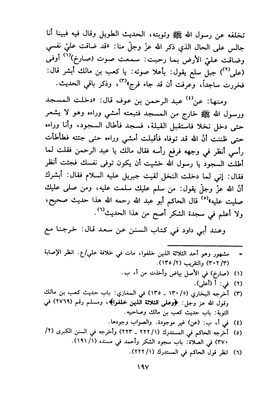 تخلفه عَن رَسُول الله - صَلَّى اللَّهُ عَلَيْهِ وَسَلَّم َ - وتوبته، الحَدِيث الطَّوِيل وَقَالَ فِيهِ فَبينا أَنا جَالس على الْحَال الَّذِي ذكر الله عز وَجل منا: " قد ضَاقَتْ عَليّ نَفسِي وَضَاقَتْ عَليّ الأَرْض بِمَا رَحبَتْ: سَمِعت صَوت (صارخ) أوفى (على) جبل سلع يَقُول: بأعلا صَوته: يَا كَعْب بن مَالك أبشر قَالَ: فَخَرَرْت سَاجِدا، وَعرفت أَن قد جَاءَ فرج "، وَذكر بَاقِي الحَدِيث.
