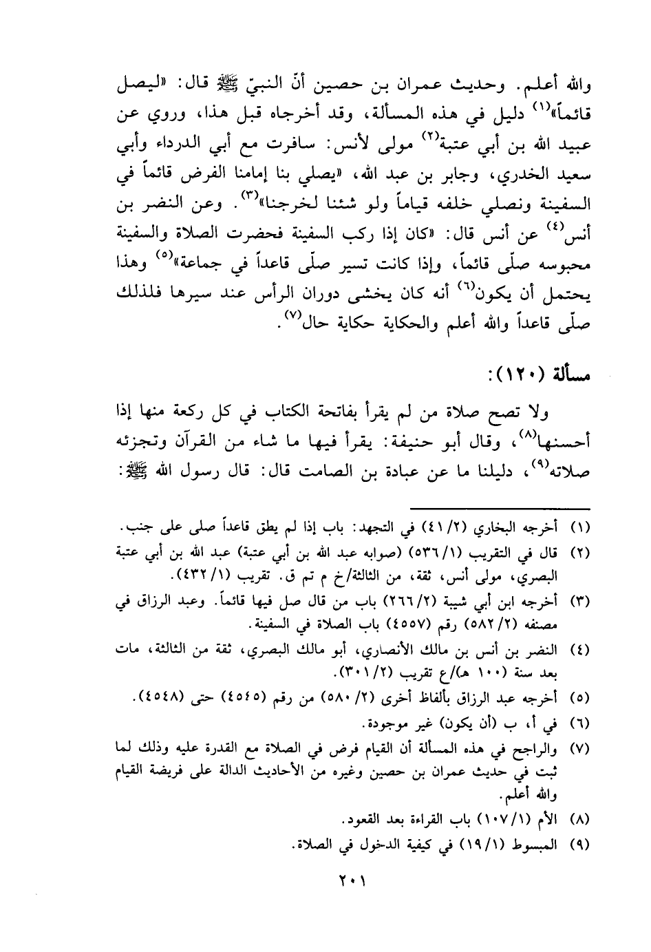 وَالله أعلم. وَحَدِيث عمرَان بن حُصَيْن أَن النَّبِي - صَلَّى اللَّهُ عَلَيْهِ وَسَلَّم َ - قَالَ: " ليصل قَائِما " دَلِيل فِي هَذِه الْمَسْأَلَة، وَقد أَخْرجَاهُ قبل هَذَا، وَرُوِيَ عَن عبيد الله بن أبي عتبَة مولى لأنس: سَافَرت مَعَ أبي الدَّرْدَاء وَأبي سعيد الْخُدْرِيّ، وَجَابِر بن عبد الله، " يُصَلِّي بِنَا إمامنا الْفَرْض قَائِما فِي السَّفِينَة وَنُصَلِّي خَلفه قيَاما وَلَو شِئْنَا لخرجنا ". وَعَن النَّضر بن أنس عَن أنس قَالَ: " كَانَ إِذا ركب السَّفِينَة فَحَضَرت الصَّلَاة والسفينة محبوسه صلى قَائِما، وَإِذا كَانَت تسير صلى قَاعِدا فِي جمَاعَة " وَهَذَا يحْتَمل أَن يكون أَنه كَانَ يخْشَى دوران الرَّأْس عِنْد سَيرهَا فَلذَلِك صلى قَاعِدا وَالله أعلم والحكاية حِكَايَة حَال.